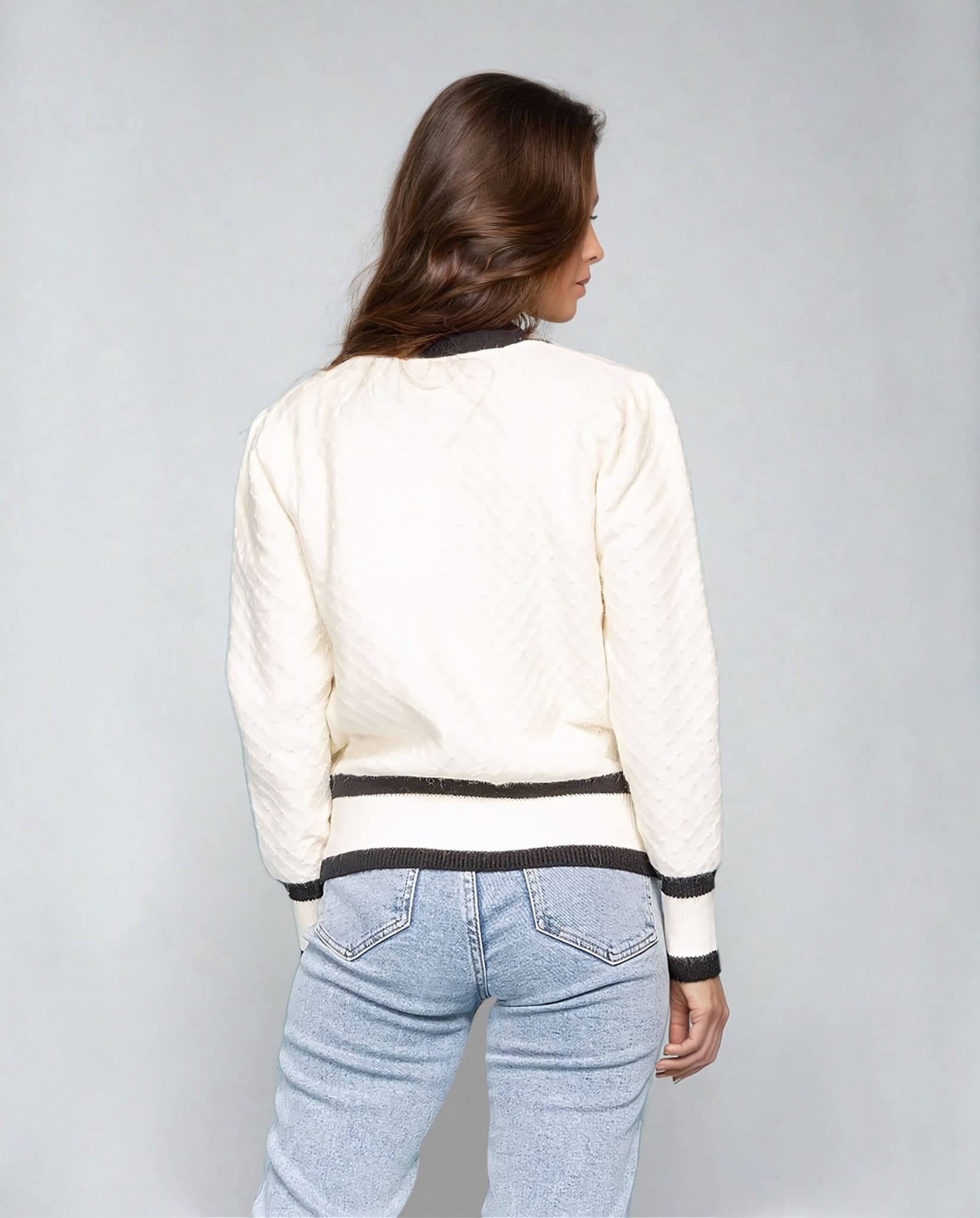 Knitted cardigan with contrast trim and lustrous pearl buttons. This pearl button sweater offers both warmth and elegance. The v-neck design and faux pockets add a touch of classic style to your wardrobe, while the white and black color combination exudes timeless charm.