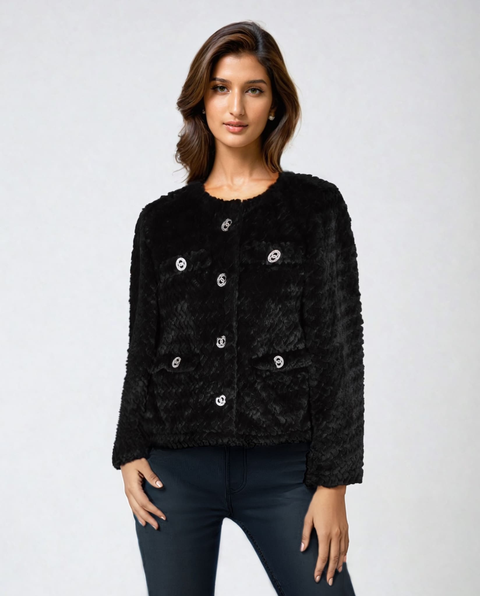 This Faux Fur Jacket in classic black features a luxuriously soft faux fur exterior while sparkling silver buttons add a touch of elegance. This short faux fur jacket is a must-have addition to your winter wardrobe.