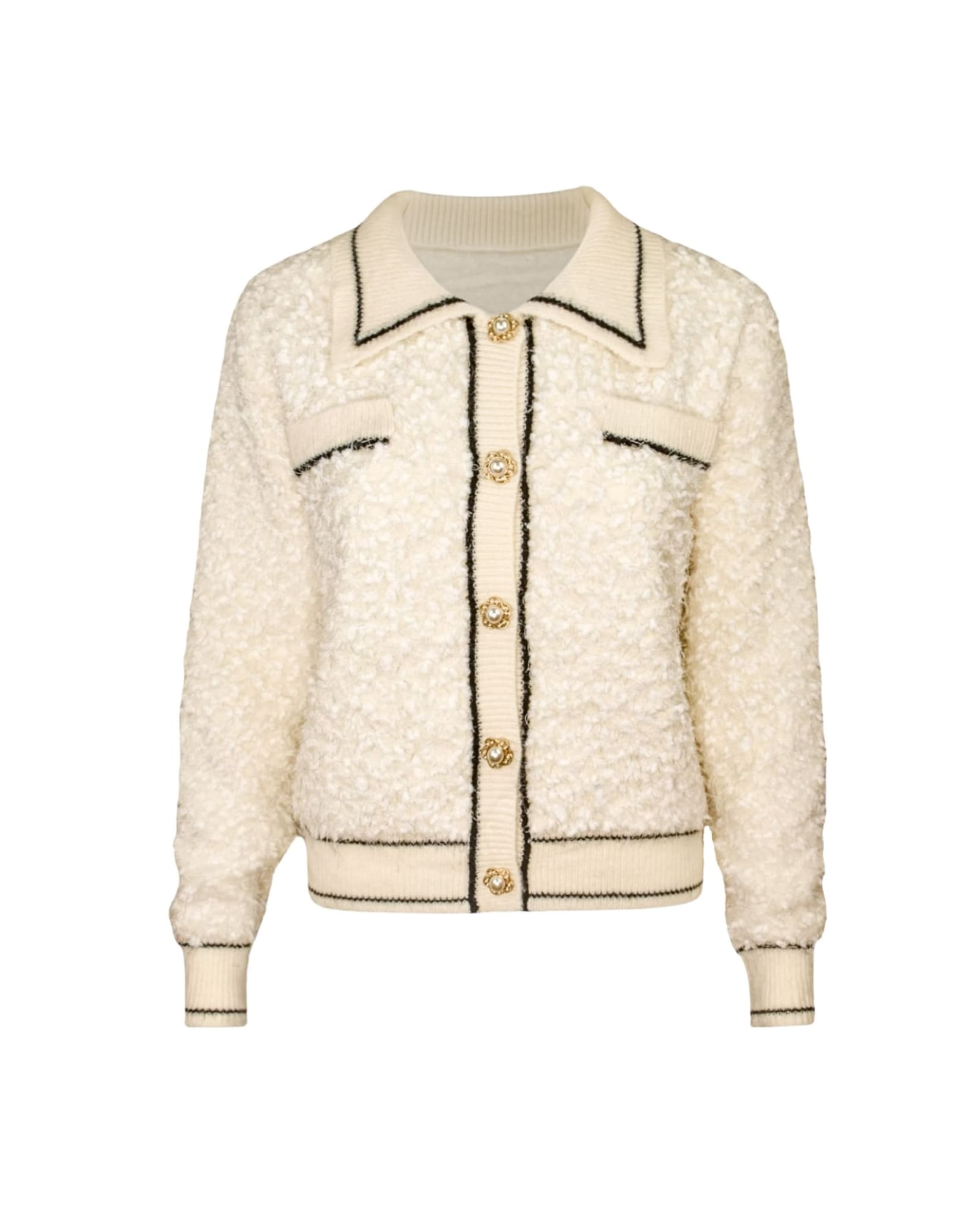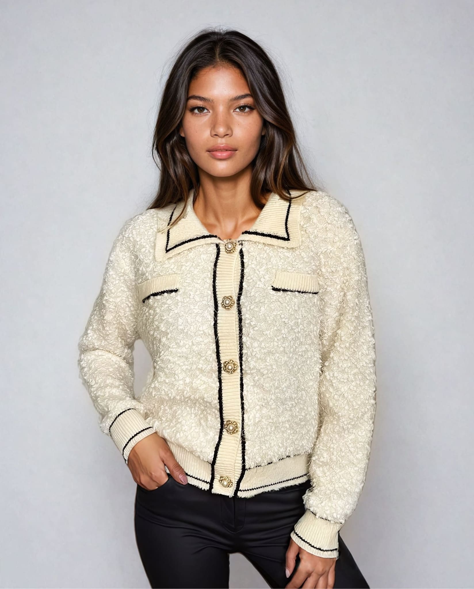 Wrap yourself in elegance with our "Cream Bouclé Cardigan". This sophisticated piece features a bouclé texture and black contrast trim, enhancing its classic appeal. Perfect for layering over your favorite tops and dresses, this cardigan effortlessly combines comfort with style, making it an essential addition to any wardrobe.