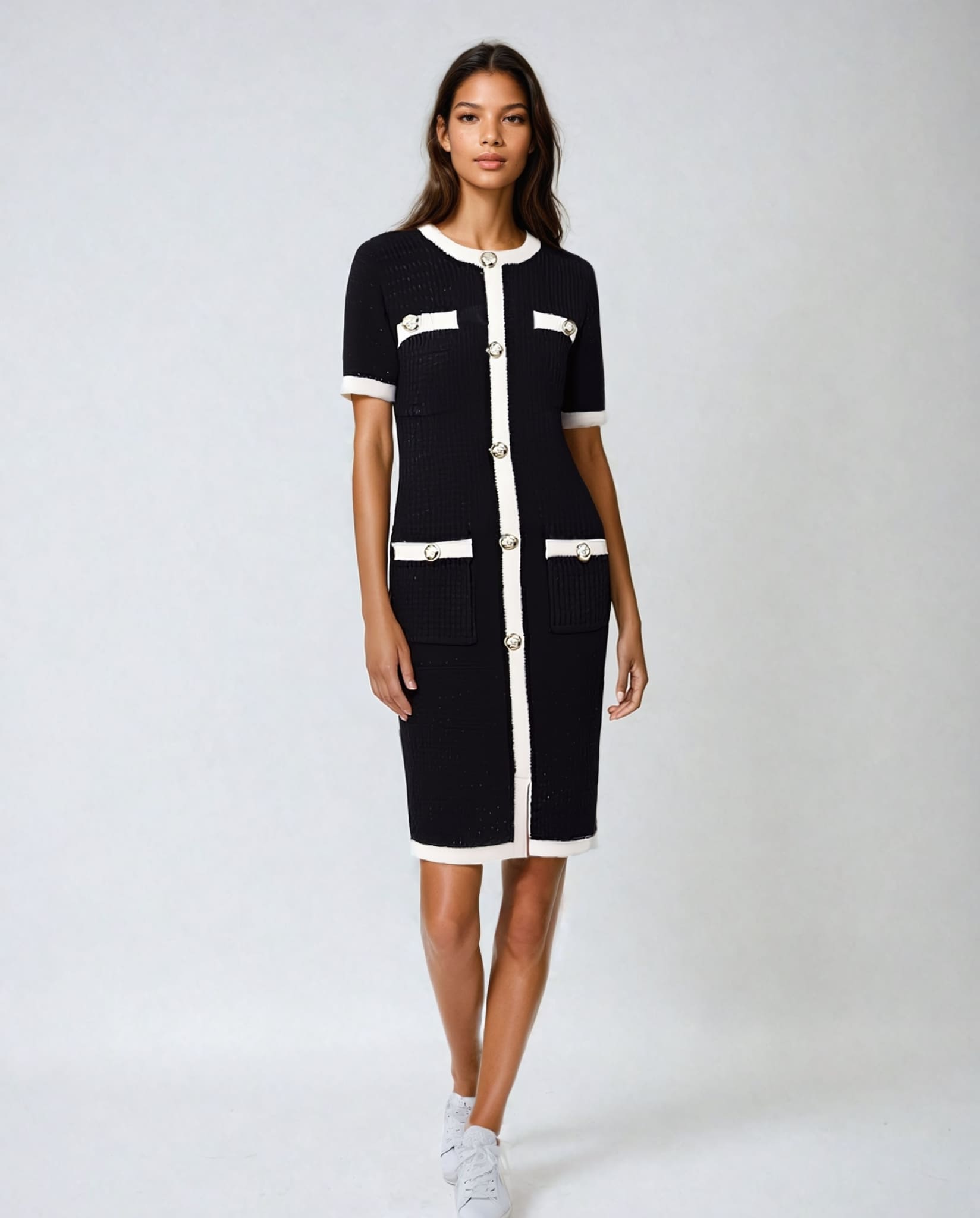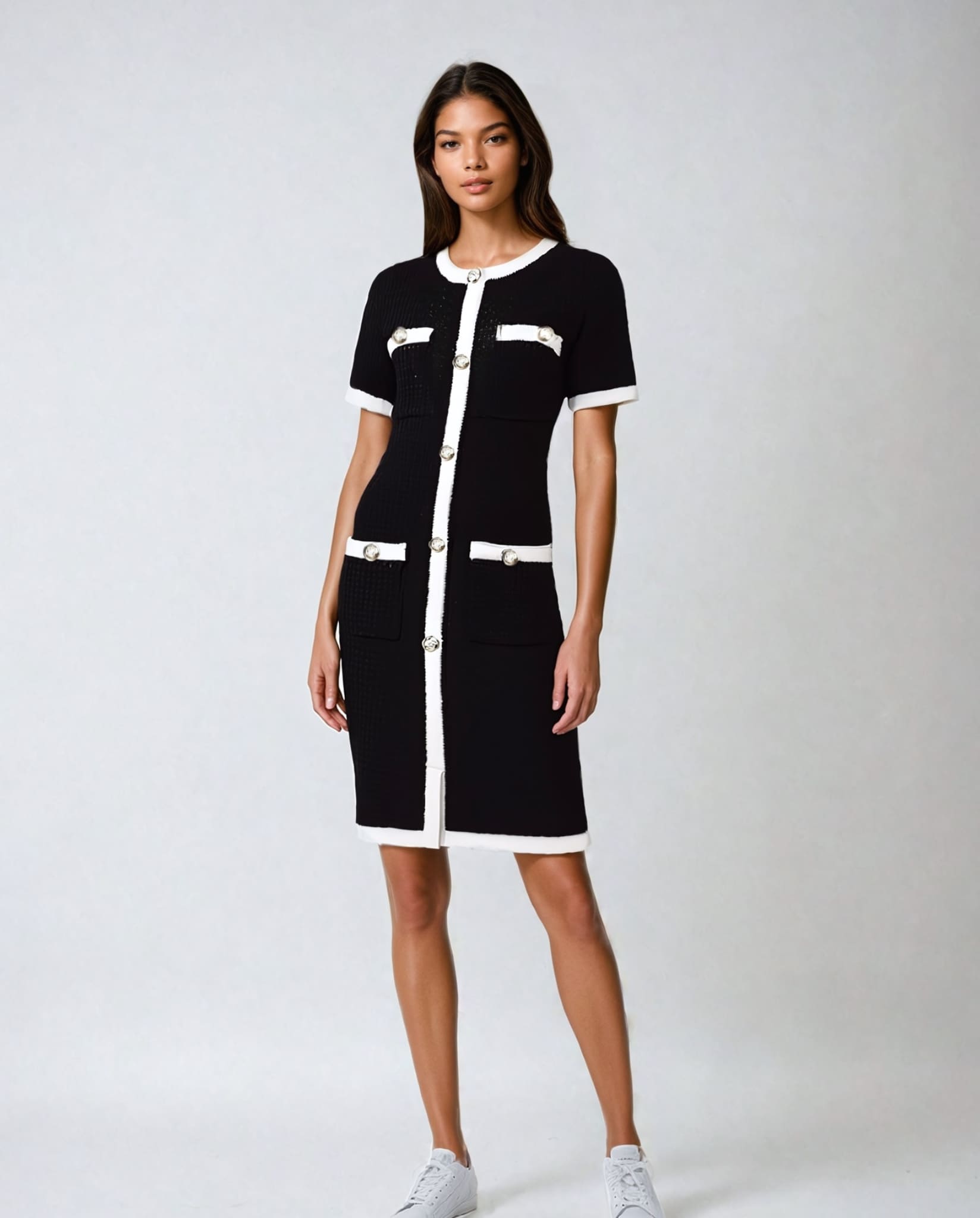 This black midi-length pullover dress features a white contrast trim, short sleeves, faux pockets and decorative gold buttons. The material is stretchy and breathable, making it perfect for various summer occasions. Available in black or white, it's a versatile addition to your wardrobe for effortless and comfortable style.