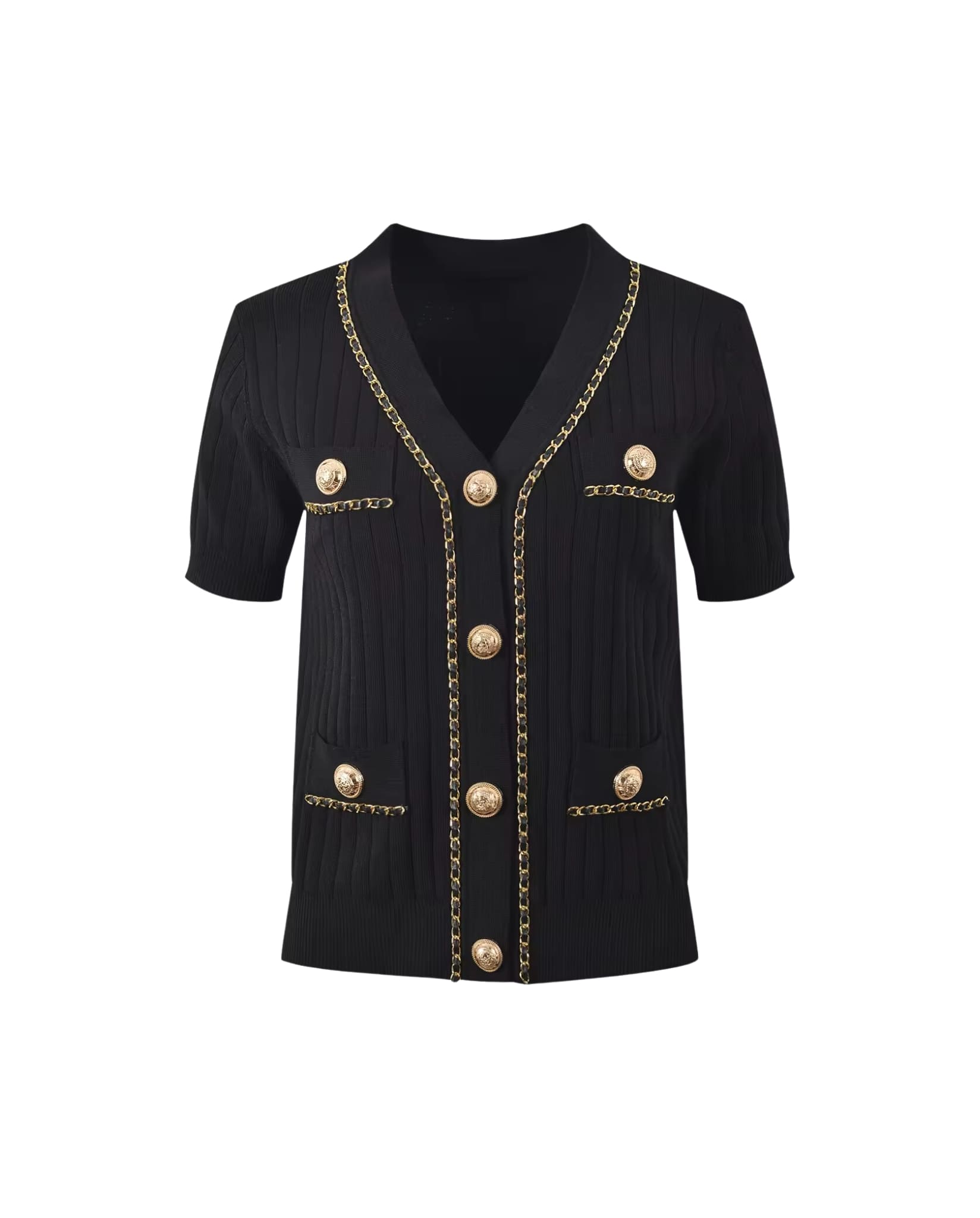 This stylish black knitted top is adorned with eye-catching gold snap buttons and intricate woven chain details. It features a ribbed texture and is made from a stretchy fabric for a comfortable, regular fit. Designed with faux pockets and short sleeves, this top is an ideal choice for those seeking a blend of elegance and practicality. Its timeless design ensures it pairs seamlessly with both casual and formal ensembles, making it a versatile addition to your wardrobe.