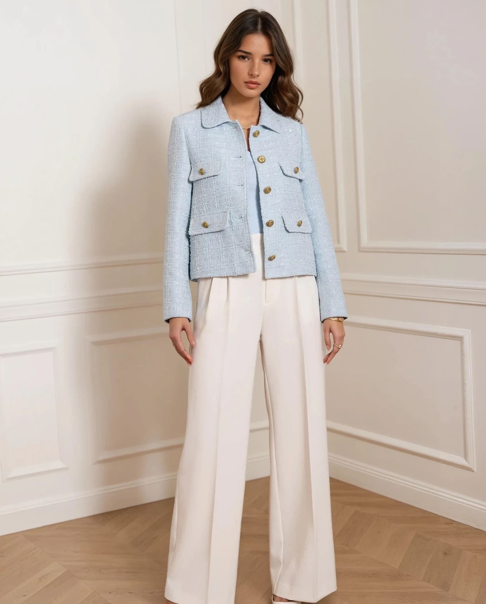A refined tweed jacket in a soft pastel blue shade with subtle sequin details woven into the fabric. Designed with a structured silhouette, a classic collar, and gold-tone buttons for an elegant touch. The decorative front pockets enhance the timeless appeal, making it a versatile choice for a polished look.