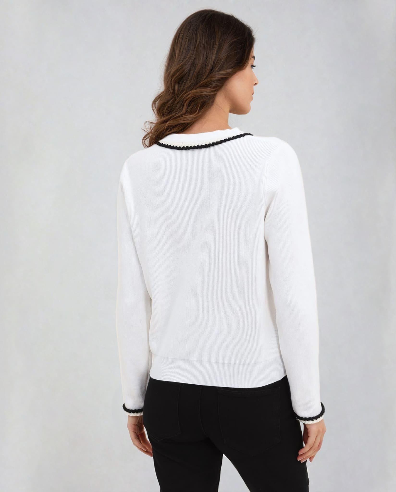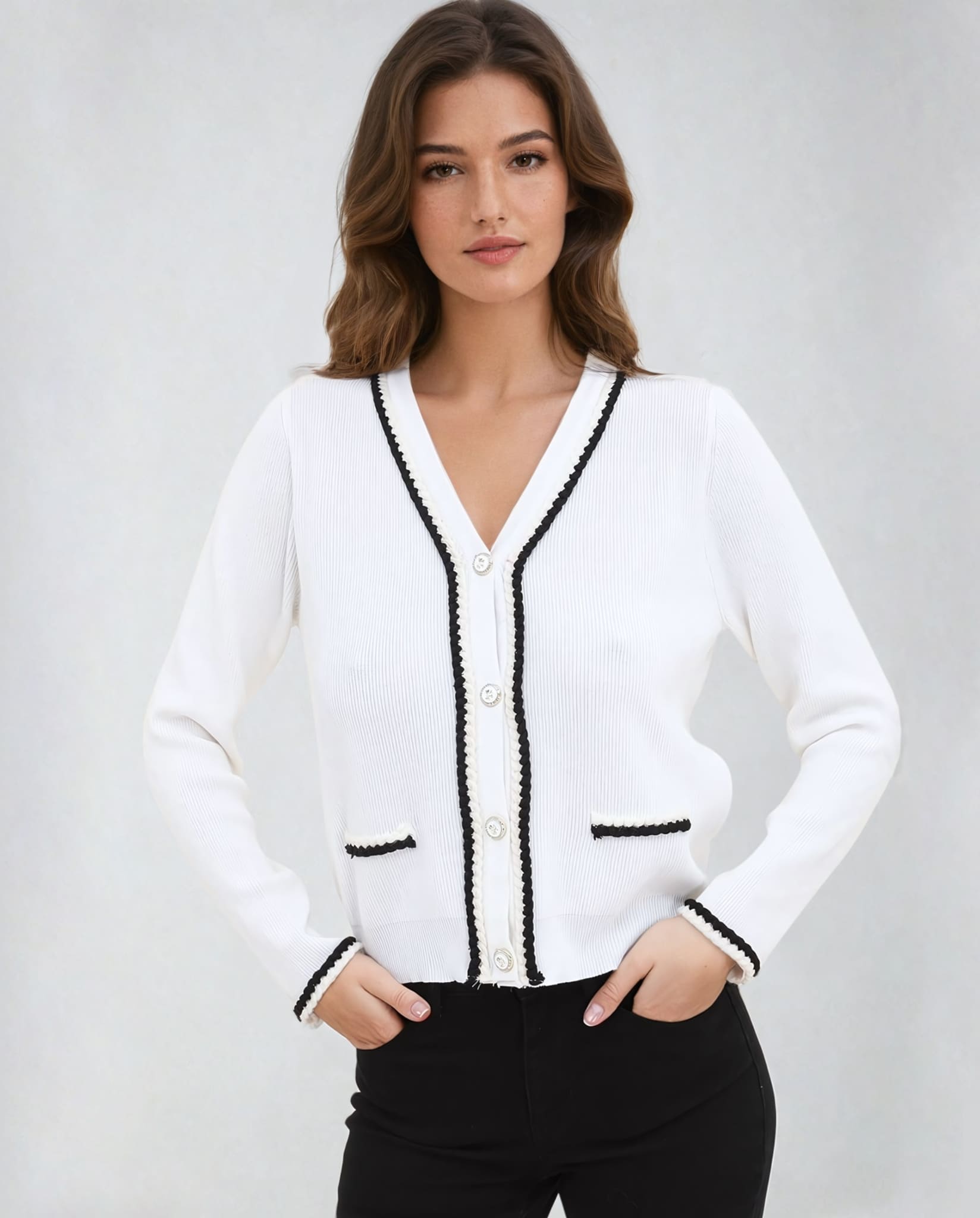 Our “Rib Knit Cardigan In White” boasts a classic v-neck silhouette and long sleeves, making it a versatile piece for layering or wearing solo. The braided contrast trim adds a touch of elegance, while its soft rib-knit fabric offers comfort.