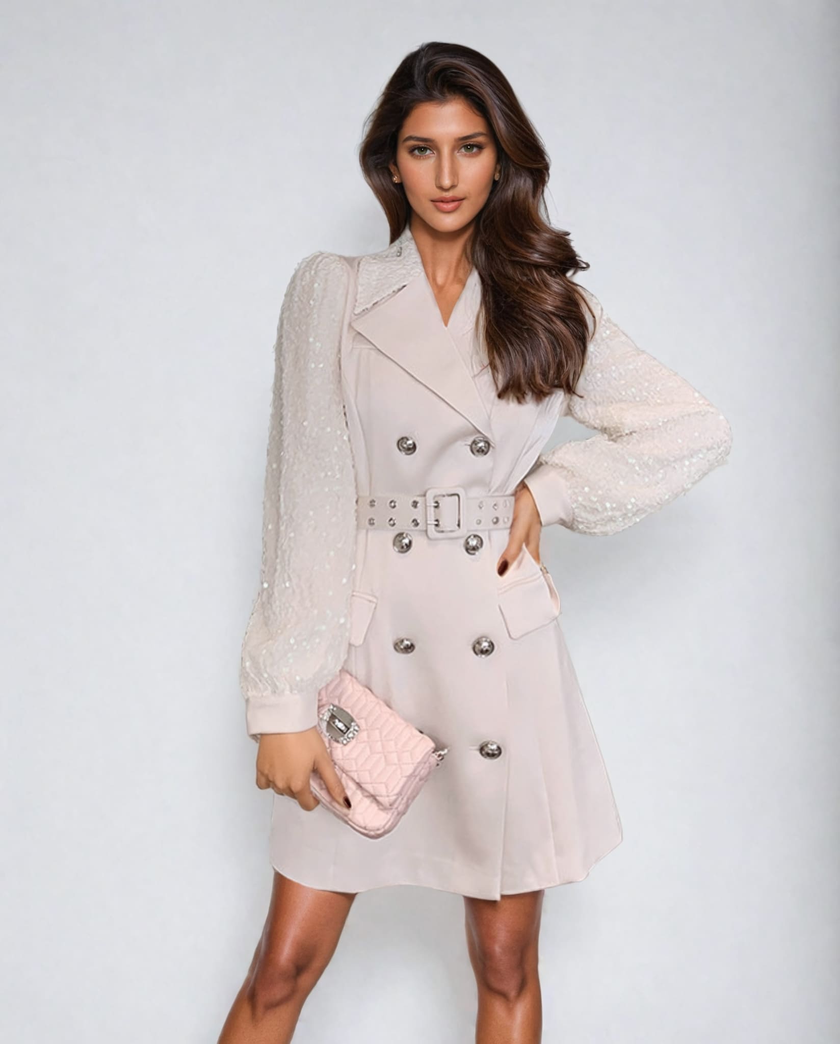 This jacket is crafted from satin material and has a belted waist and silver buttons. The standout feature of this piece is the lantern sequin sleeves, which add a touch of sparkle to your outfit. Whether you're heading to a special event or just want to make a statement, these sleeves will catch everyone's attention.