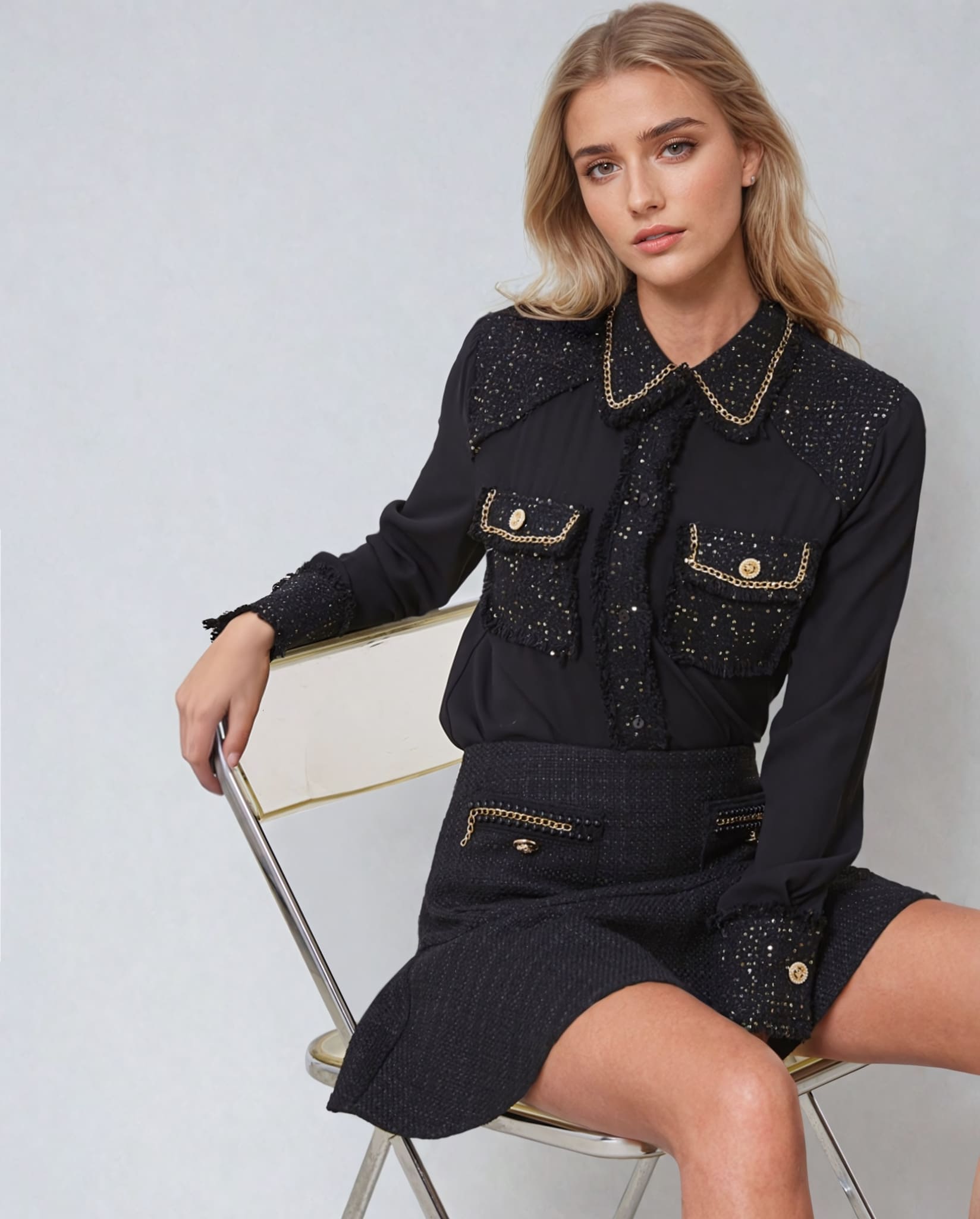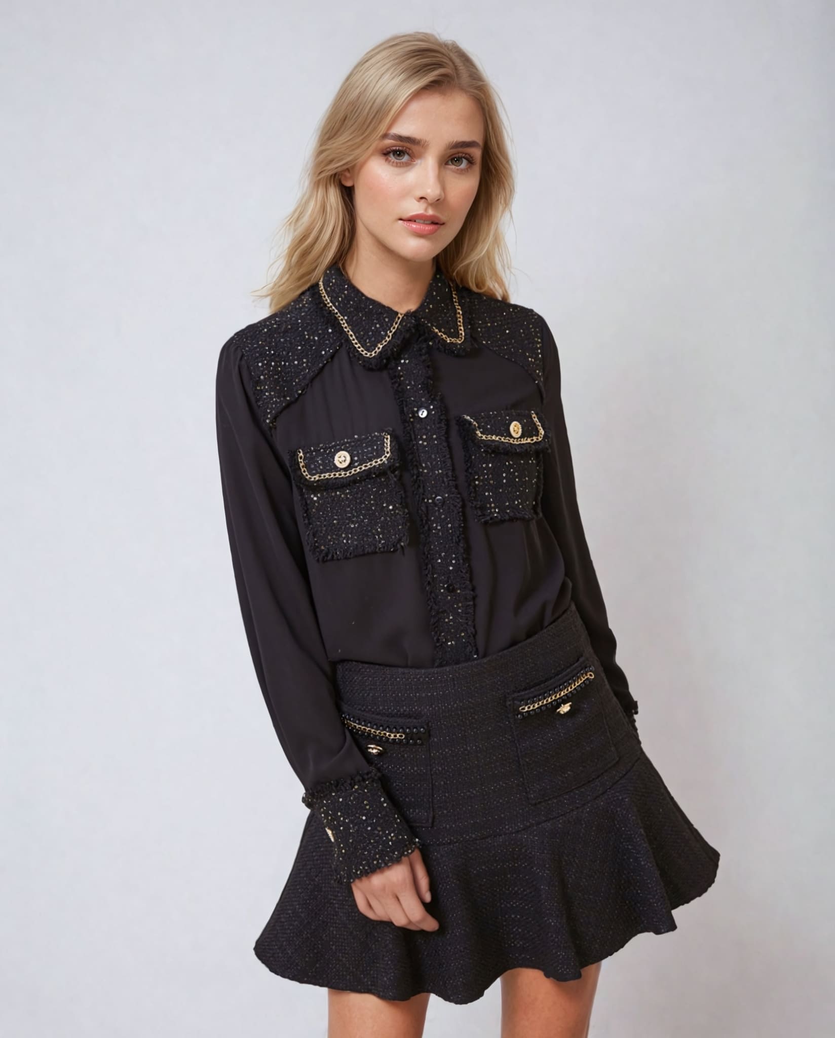 Introducing our "Shirt With Tweed Details" – a perfect blend of timeless black and exquisite gold details.