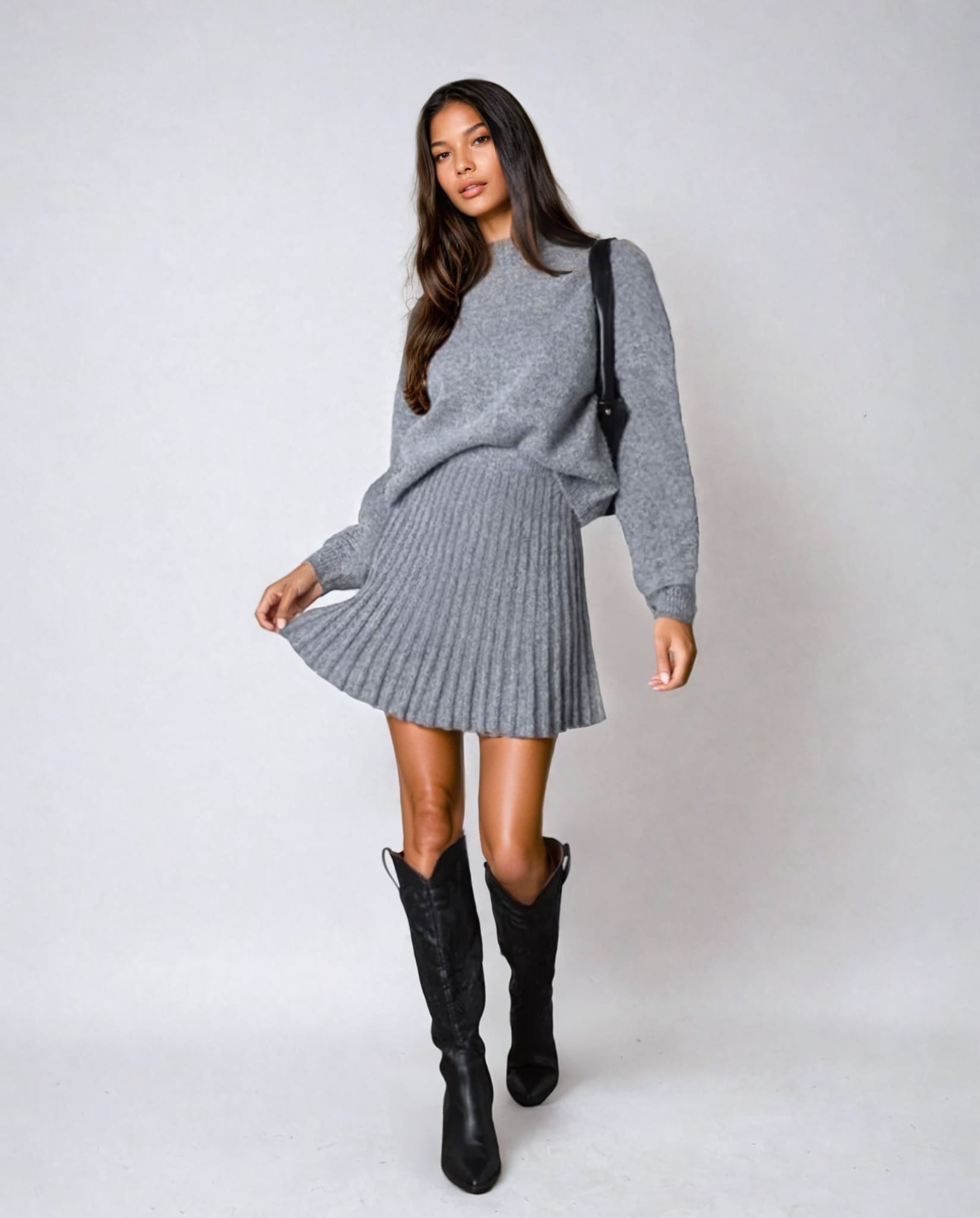 Upgrade your fall and winter wardrobe with our "Sweater And Skirt Knit Set" in grey, a chic two-piece ensemble perfect for cozy yet stylish looks. Made from soft knitted material, this set includes a comfortable pullover sweater with long sleeves and a high-waisted pleated mini skirt.