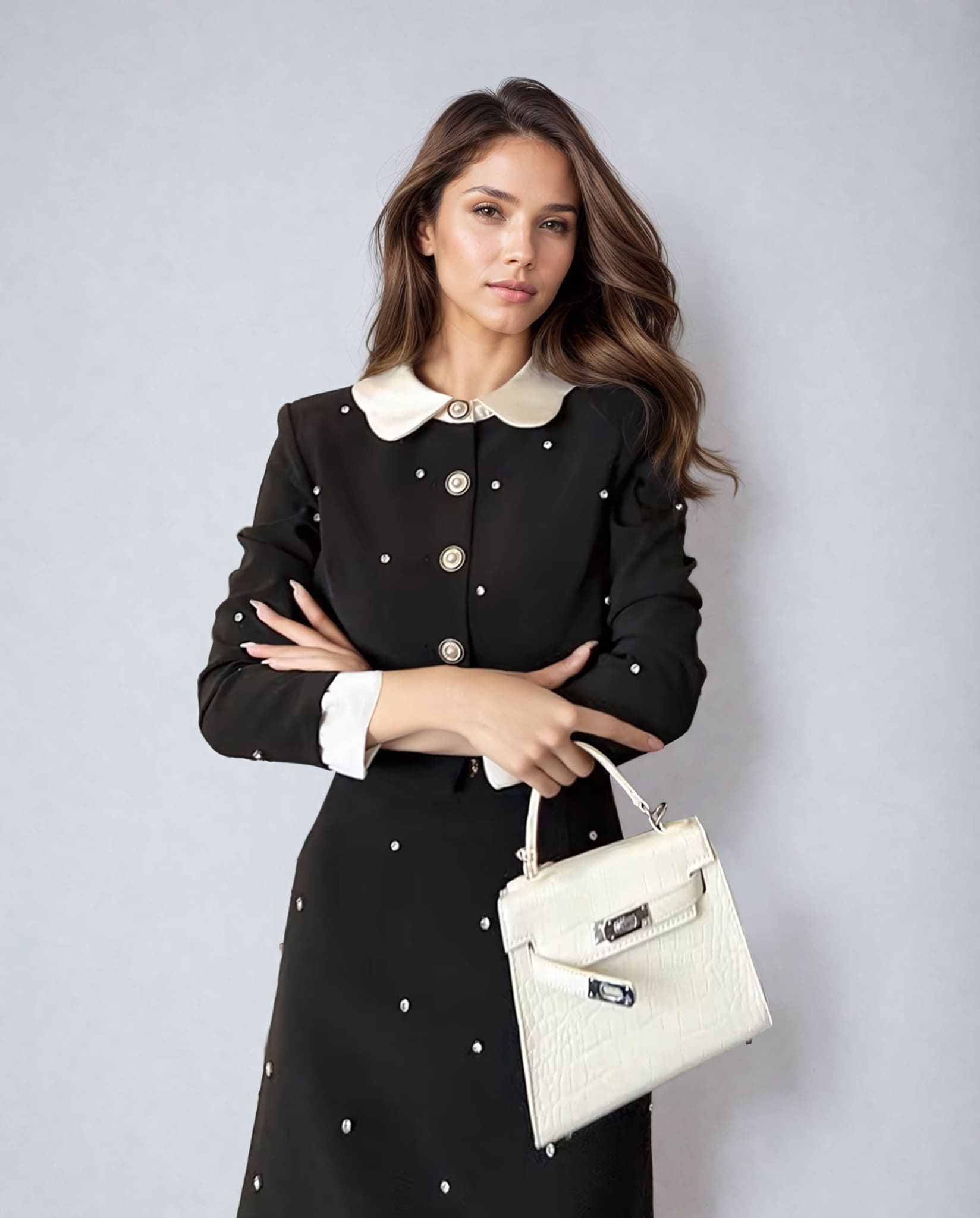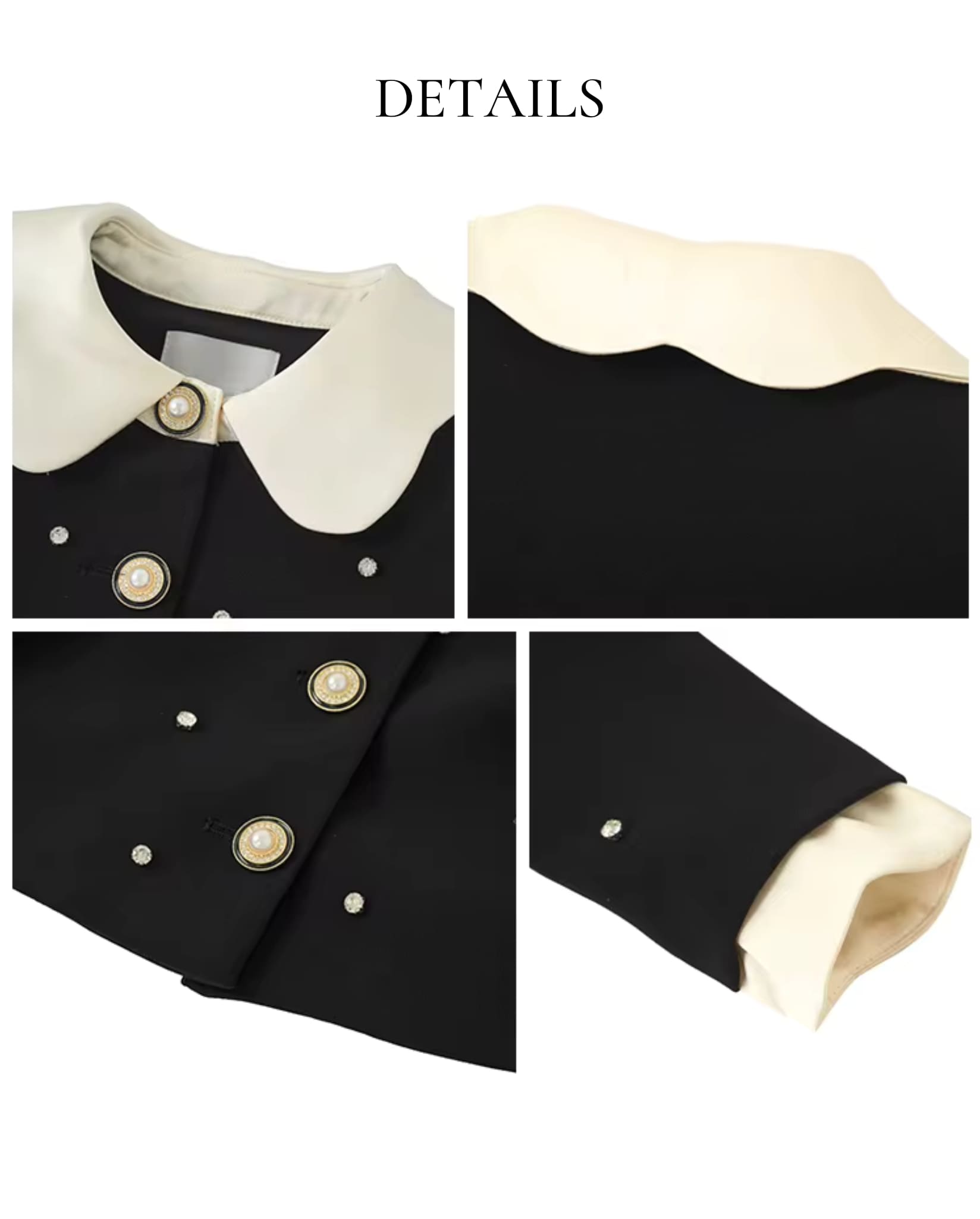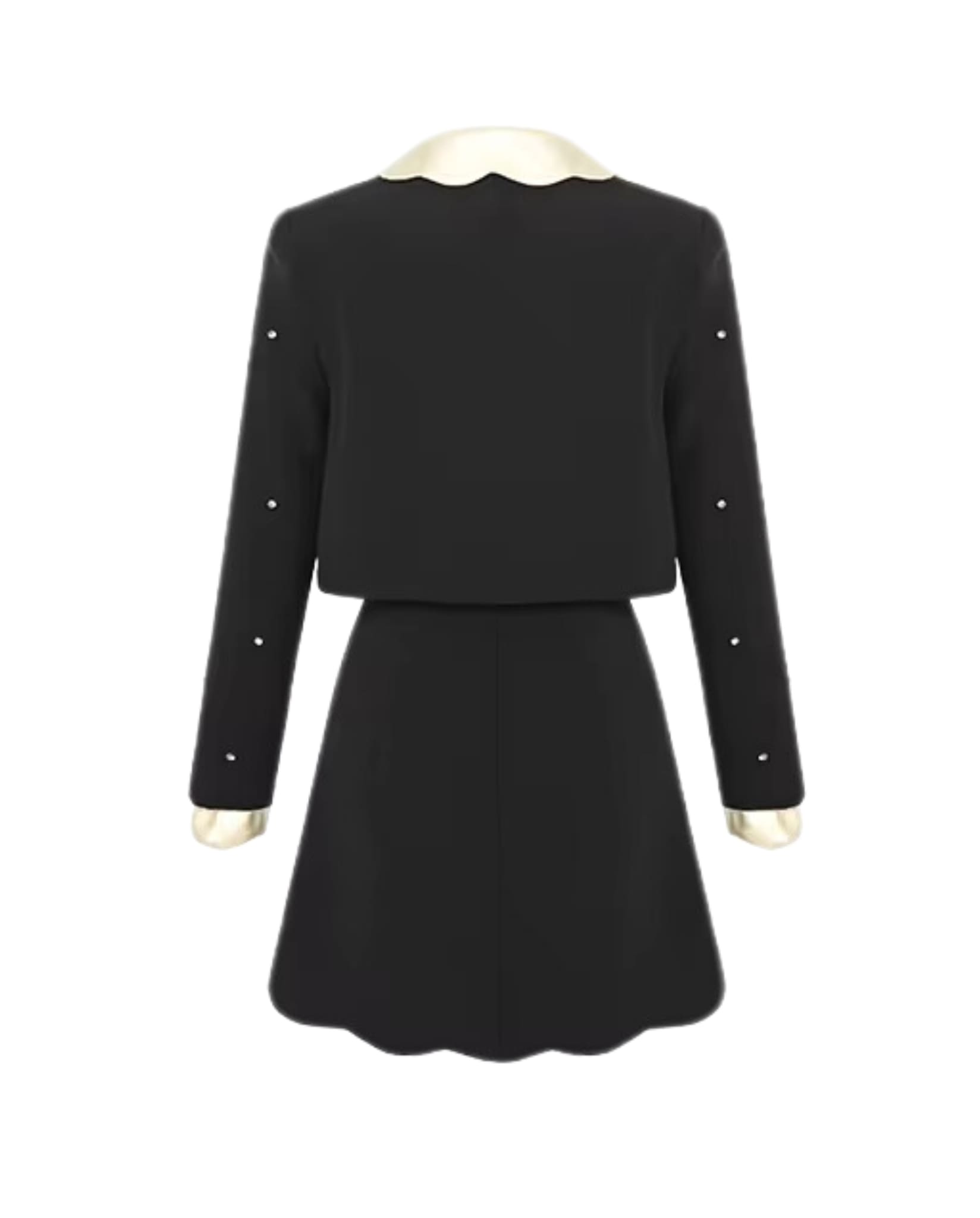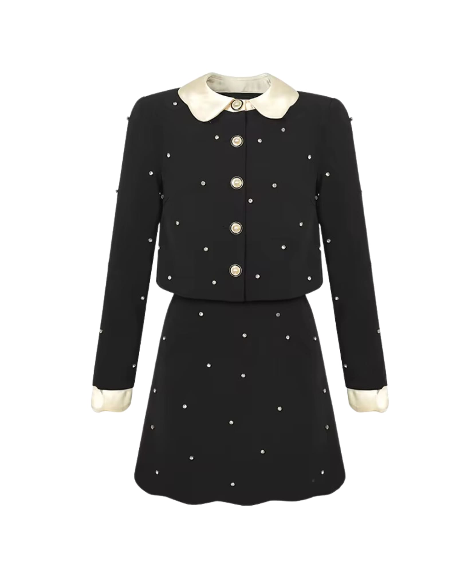 Discover classic elegance with this "Timeless Two-Piece Skirt Set", featuring a cropped blazer adorned with a scalloped satin collar and pearl buttons. The high-waisted mini skirt perfectly complements the structured top, both embellished with delicate crystal accents for a hint of sparkle.
