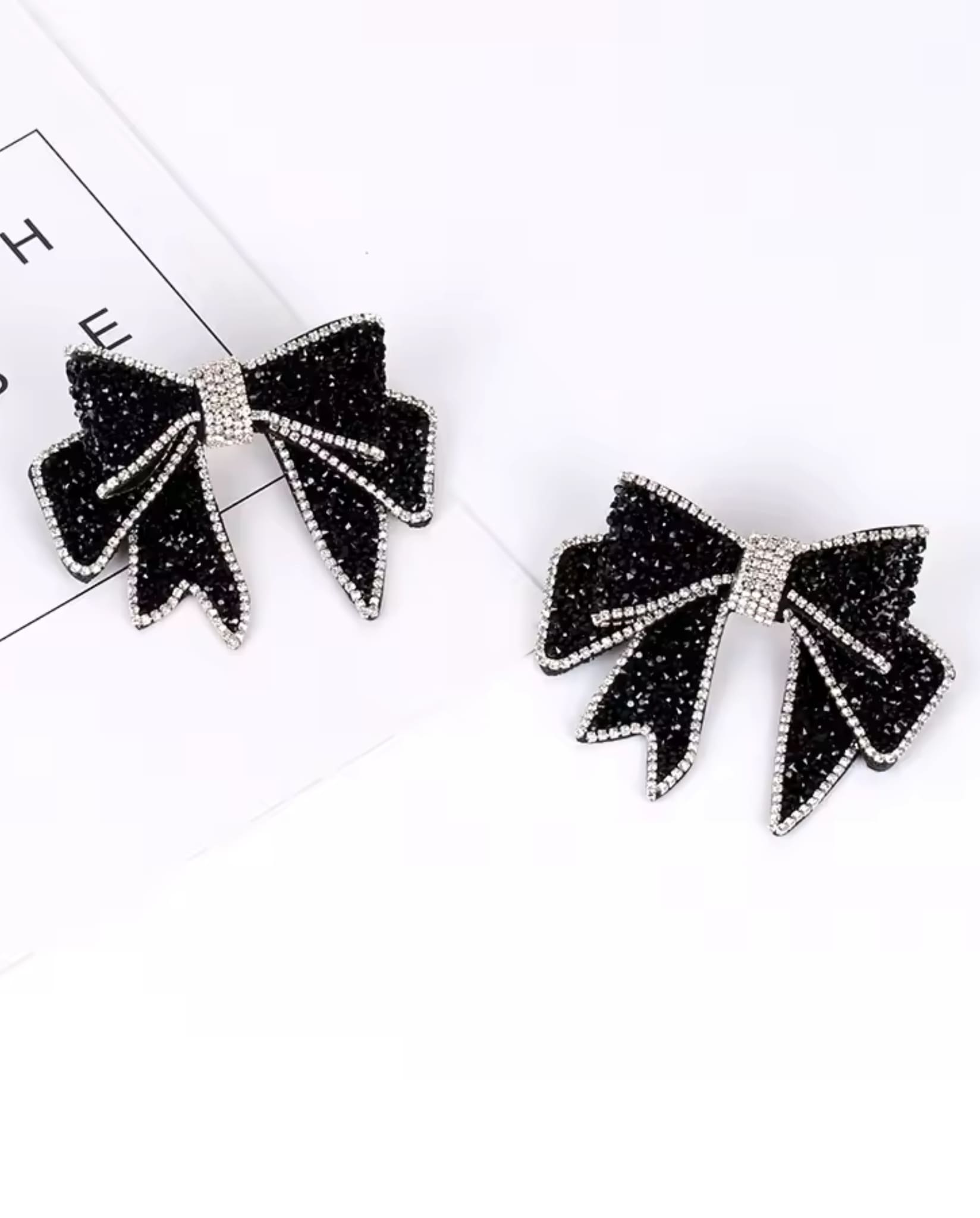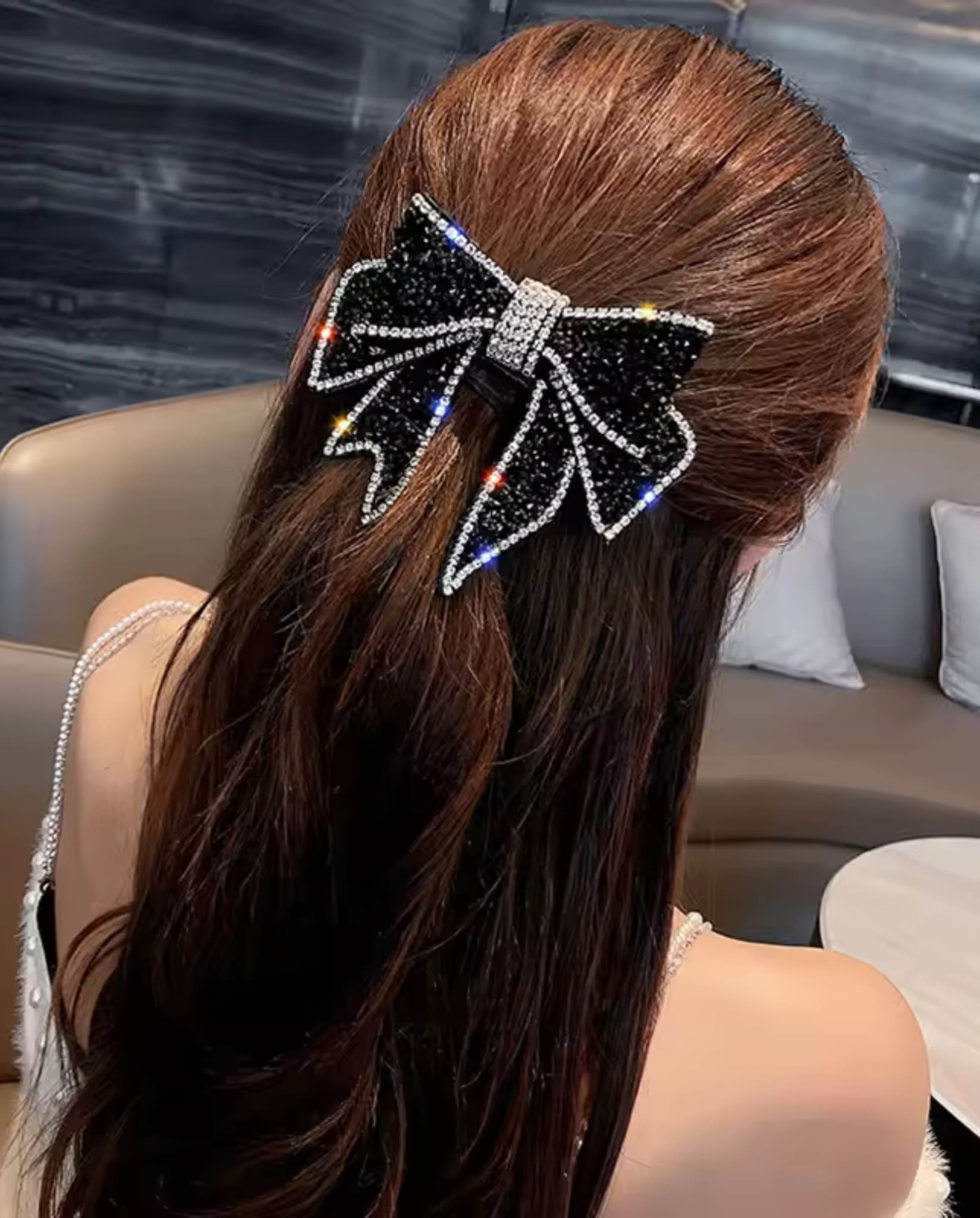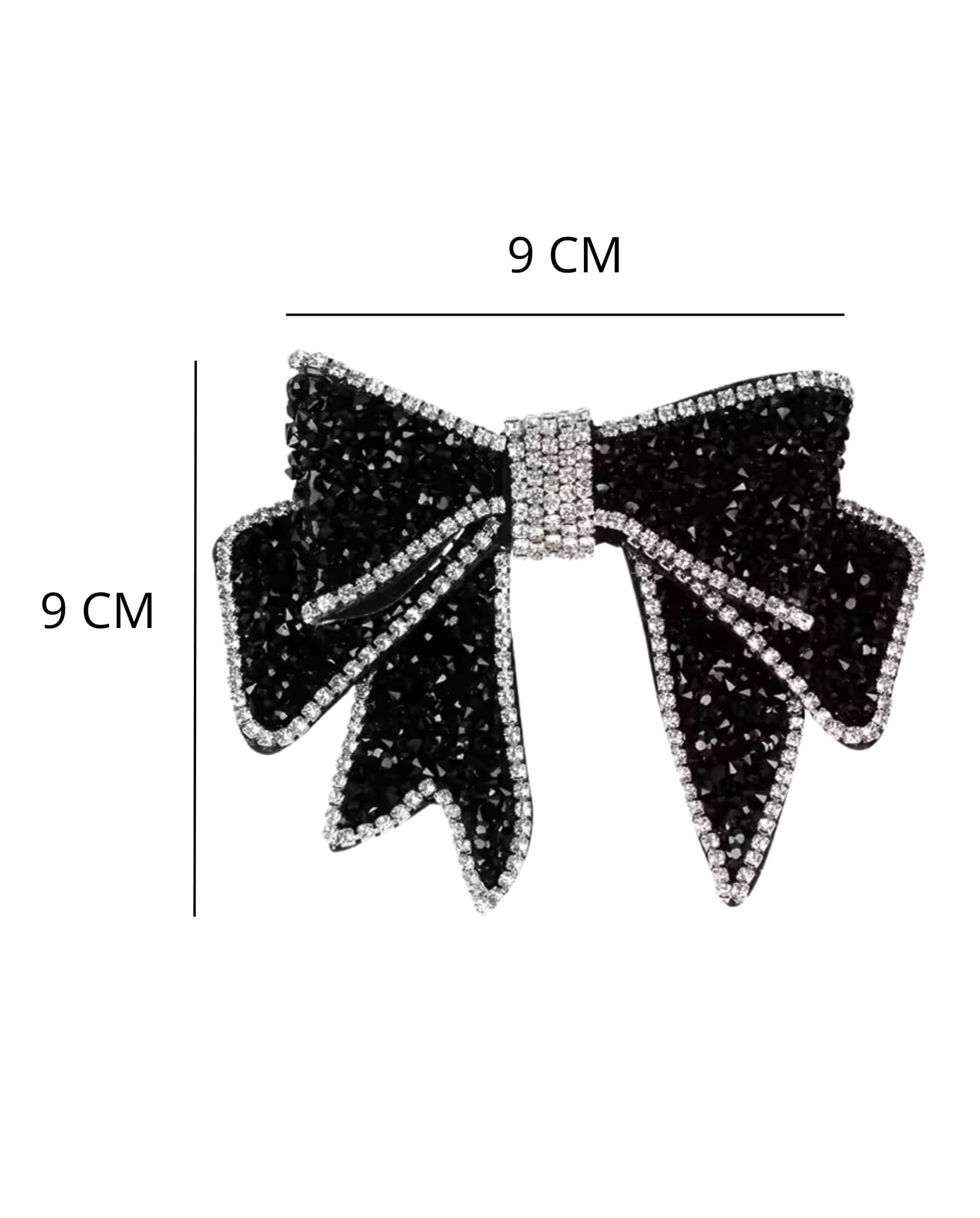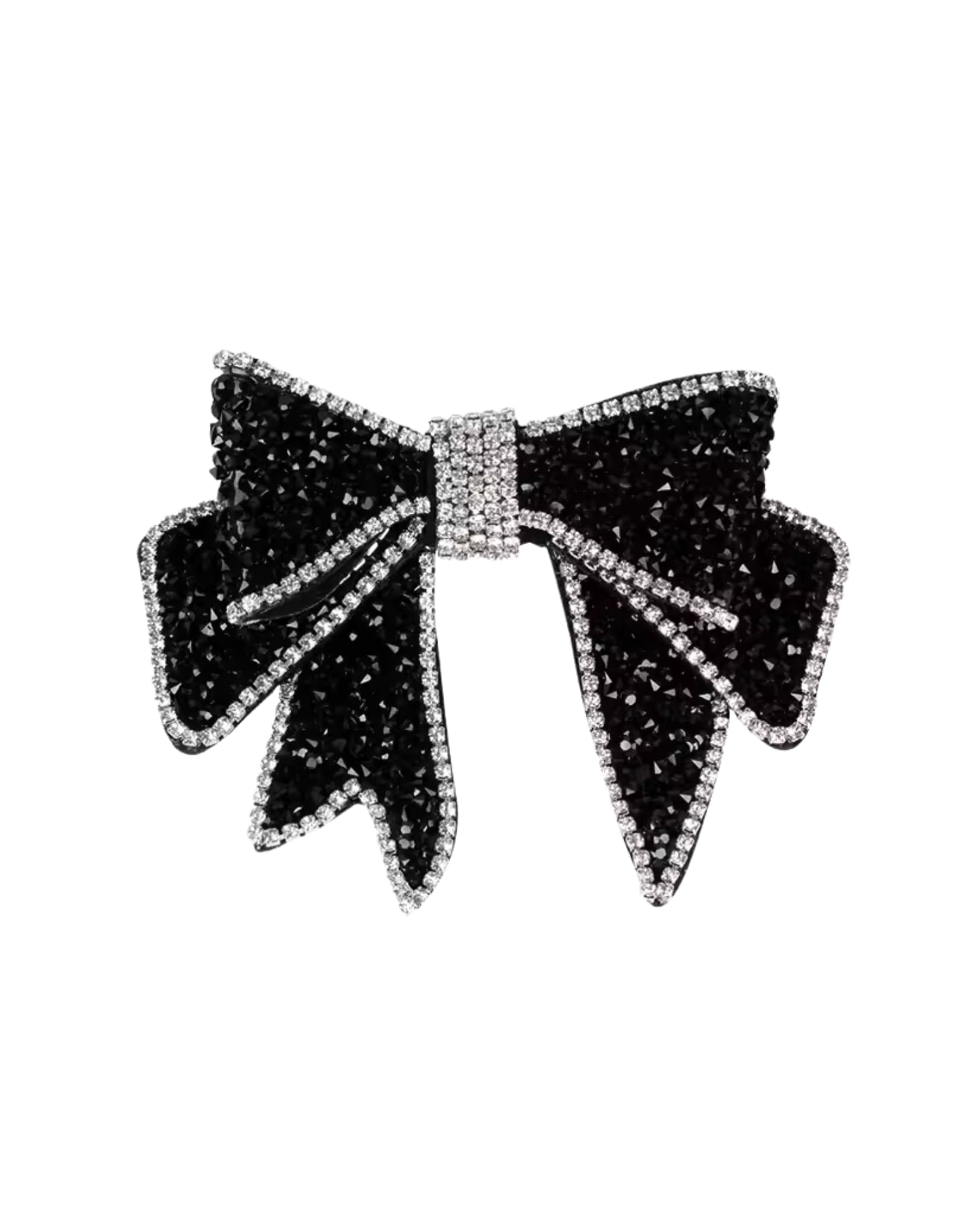 Add a touch of glamour to your hairstyle with this exquisite black crystal hair clip. Designed with a French barrette closure for secure hold, it features a beautiful bow shape adorned with shimmering black crystals and outlined with sparkling rhinestones. Perfect for formal occasions, this hair clip is an elegant accessory to enhance any look.