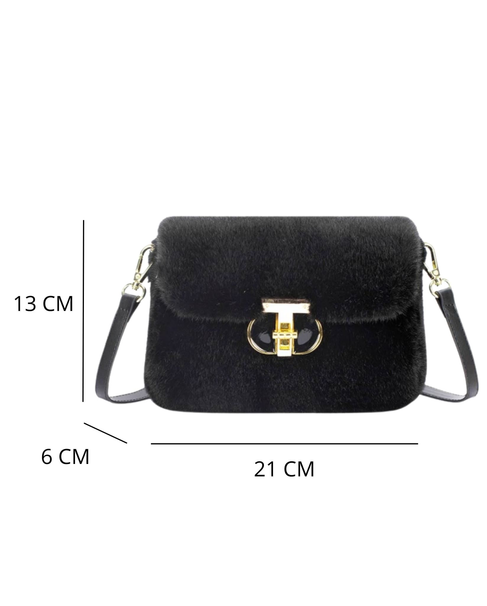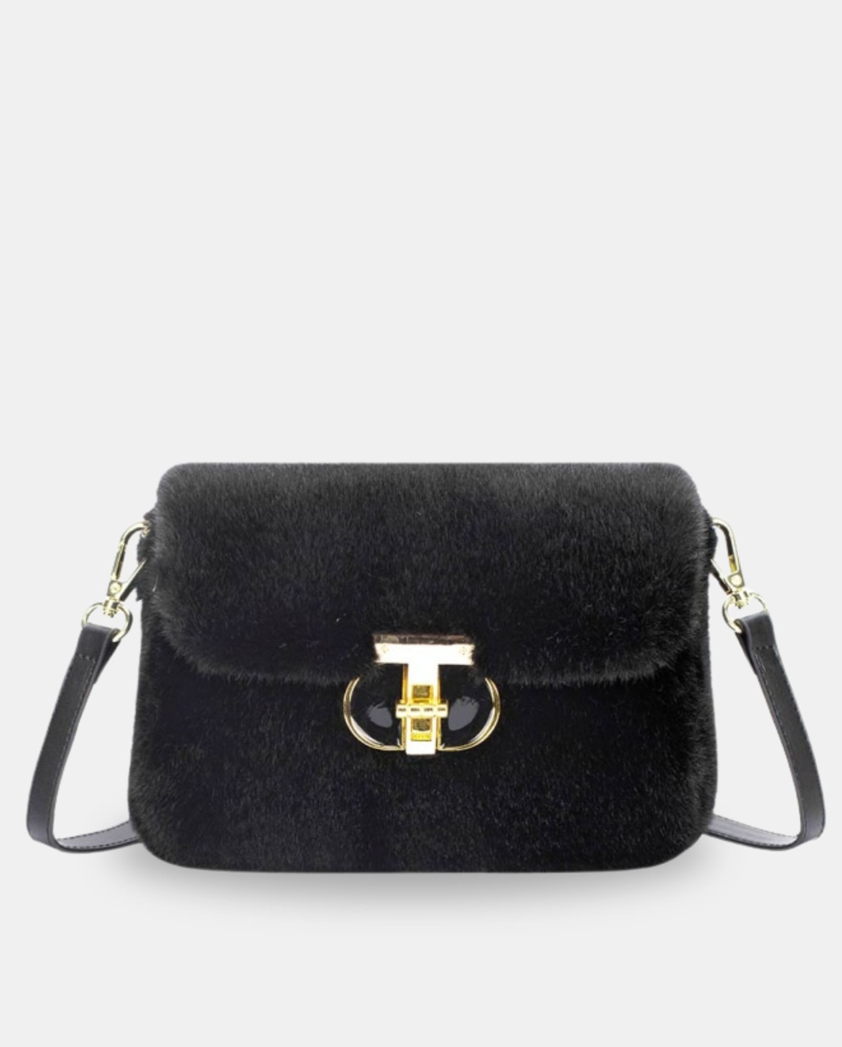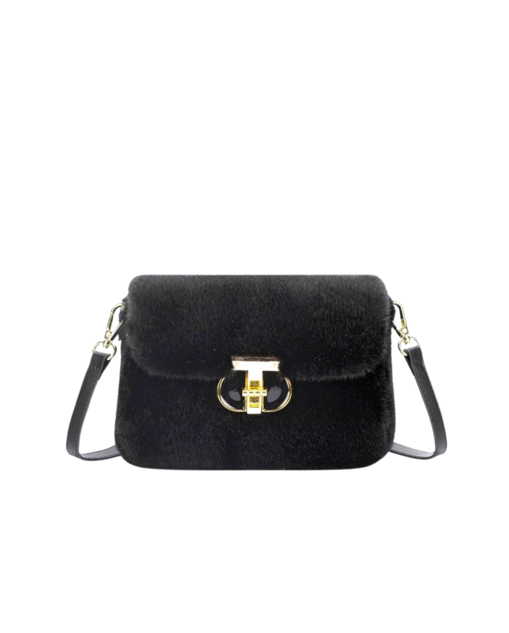 The "Petite Plush Crossbody Bag" in a soft black faux fur adds a cozy and stylish touch to any outfit. Its compact size is perfect for daily essentials, with one compartment and an interior pocket. The adjustable shoulder strap offers a customized fit, while the turnstile clasp ensures your belongings stay secure. A great accessory for adding texture to your look.