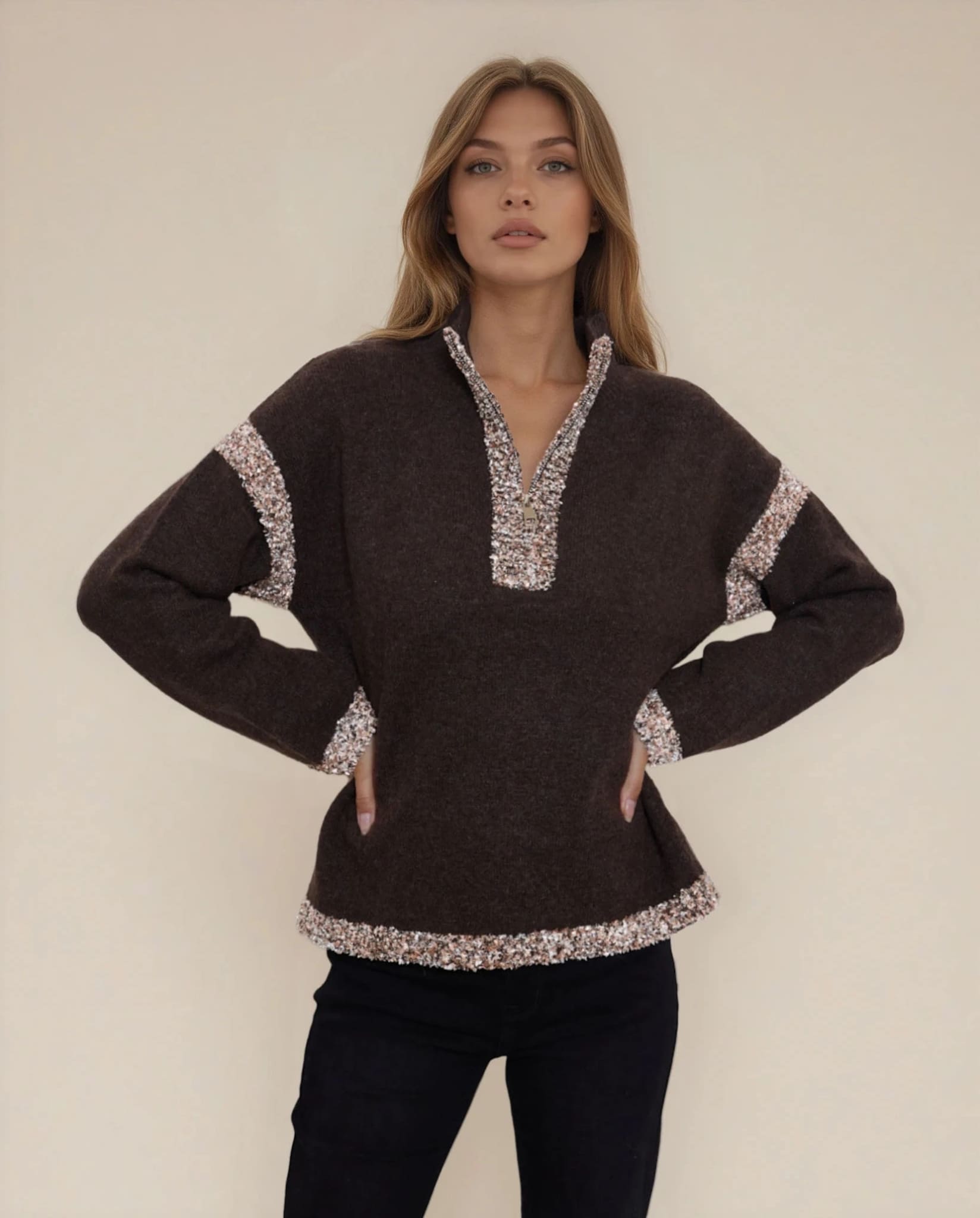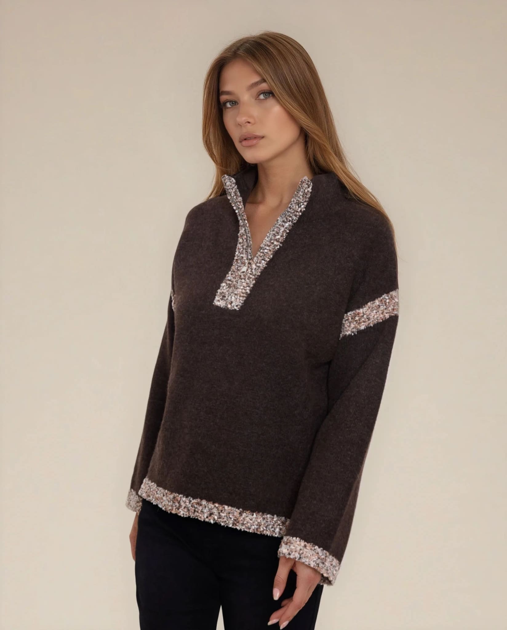 A soft brown pullover with textured contrast trim along the collar, cuffs, and hem. The knit is smooth and the half-zip adds a practical touch for layering. A nice everyday pullover that’s both comfortable and effortless to style.