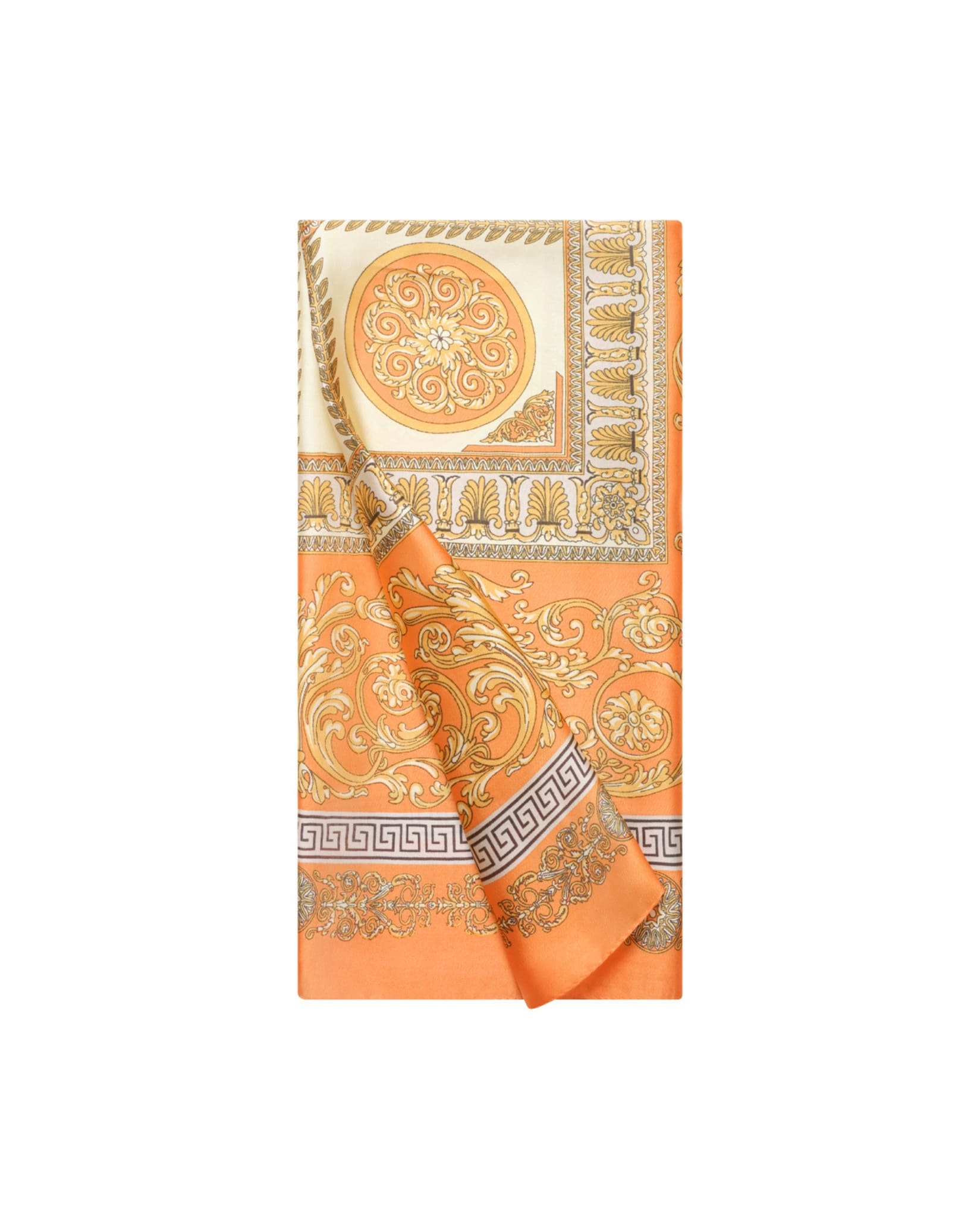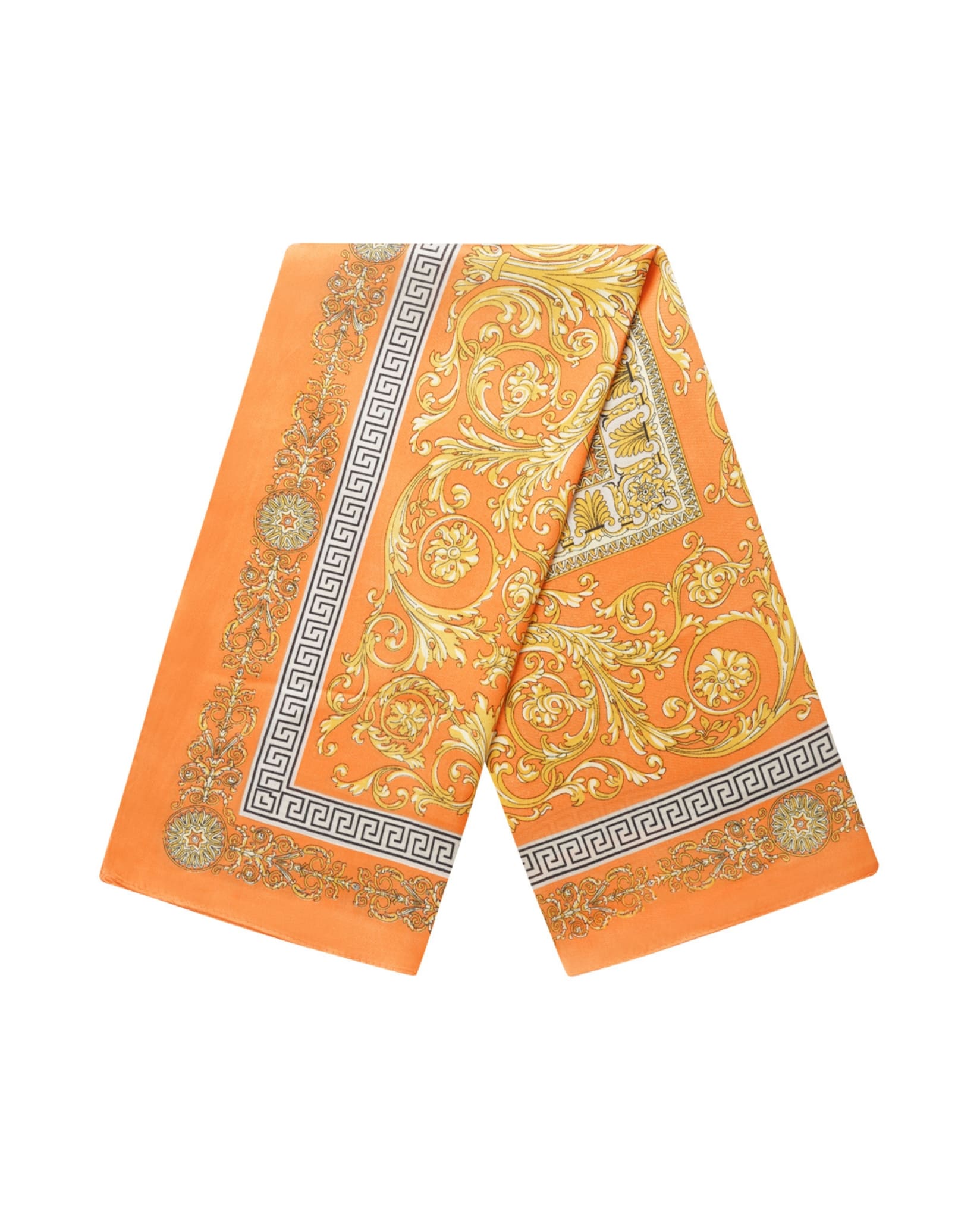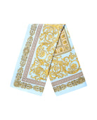 A lightweight square scarf with a decorative baroque-inspired print in fresh, summery colors. A simple way to add warmth and pattern to everyday outfits during the spring and summer months.