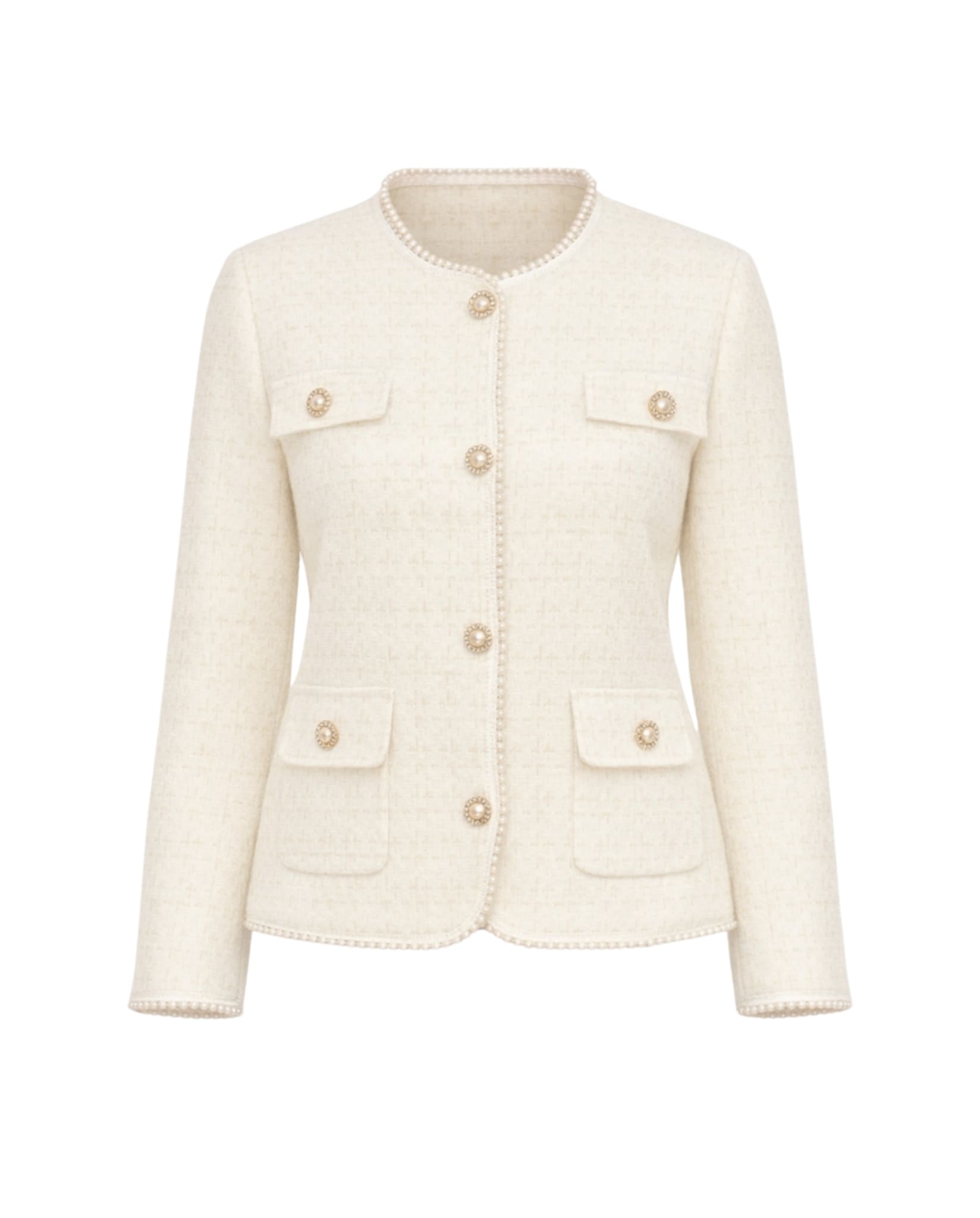A soft and elegant cardigan with delicate pearl trim along the edges for a refined touch. The pearl-adorned buttons with sparkling rhinestone accents enhance its sophisticated design. Crafted from a smooth and comfortable fabric, this cardigan is a versatile addition to any wardrobe.