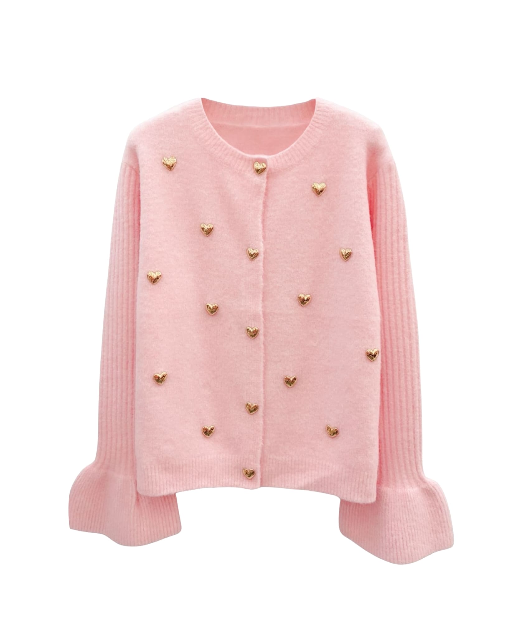 A light pink cardigan with gold heart details and a feminine silhouette. Designed with a button-up front and long, cozy sleeves finished with subtle ruffle cuffs.