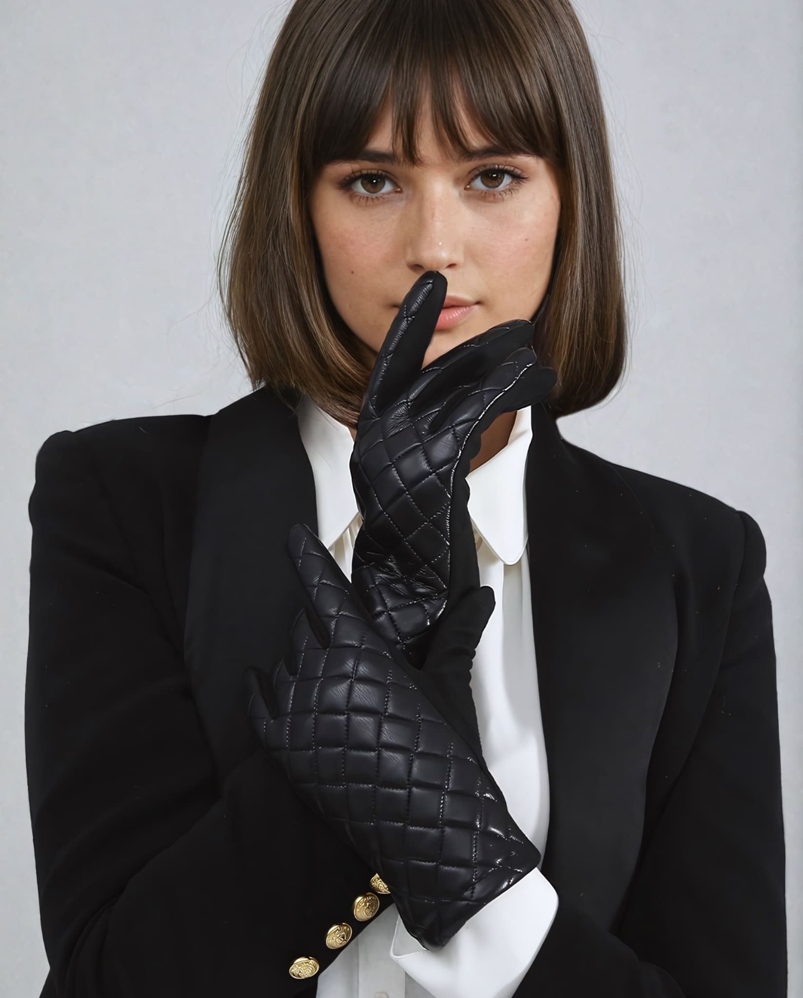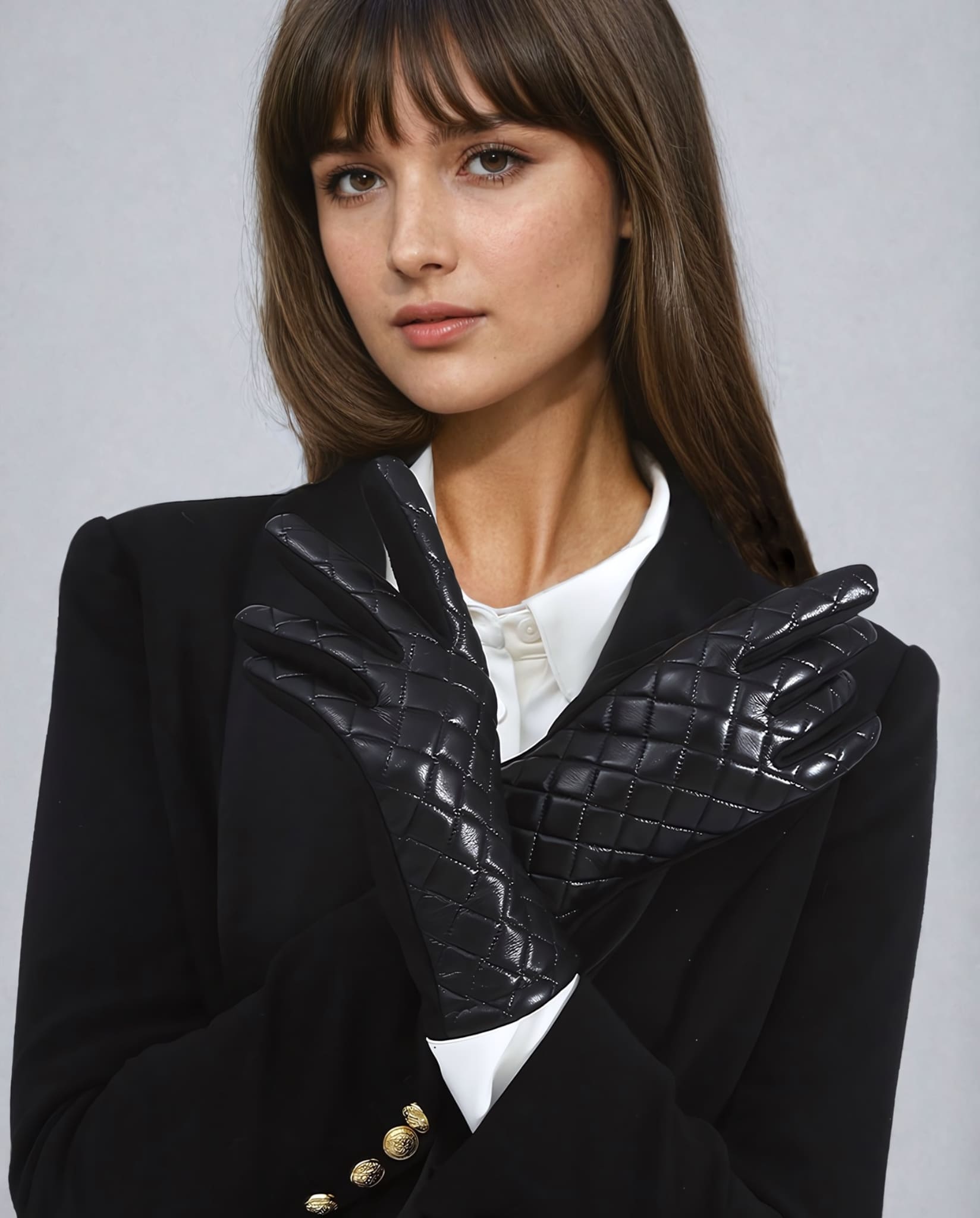 These chic gloves feature a sleek faux leather exterior with an elegant quilted pattern, adding a touch of sophistication to your cold-weather wardrobe. The built-in touchscreen function allows you to easily use your smartphone or tablet without needing to remove them. Whether you're heading to work or out for an evening, these gloves offer the perfect balance of fashion and functionality for the colder months.