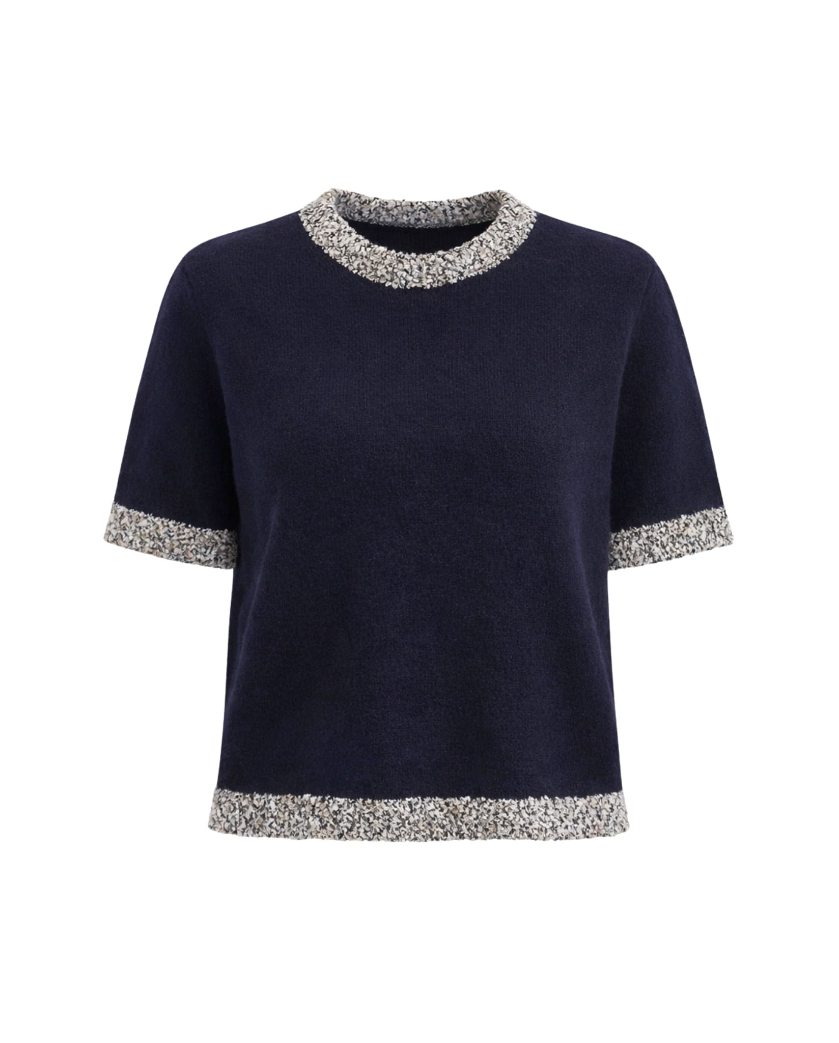 A soft knitted top in deep navy, elevated with beautifully textured contrast edges. This short sleeve knit combines comfort and style, the kind of top that works effortlessly for both casual and dressier occasions.