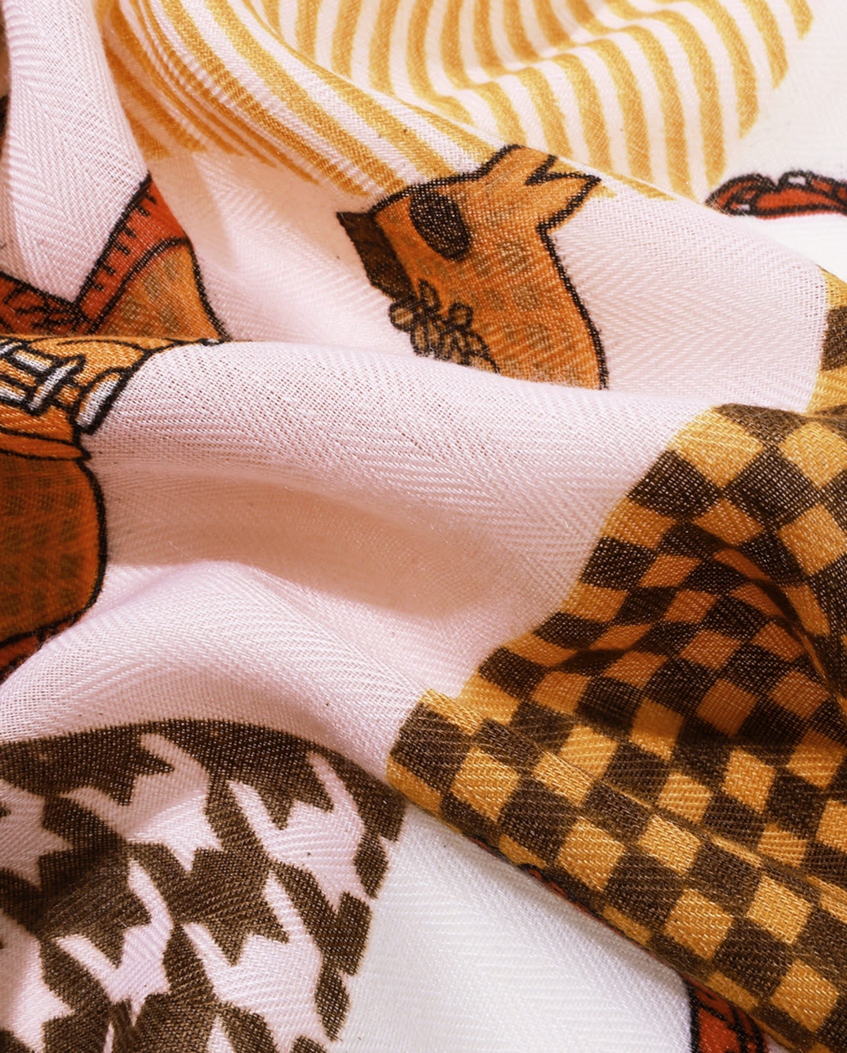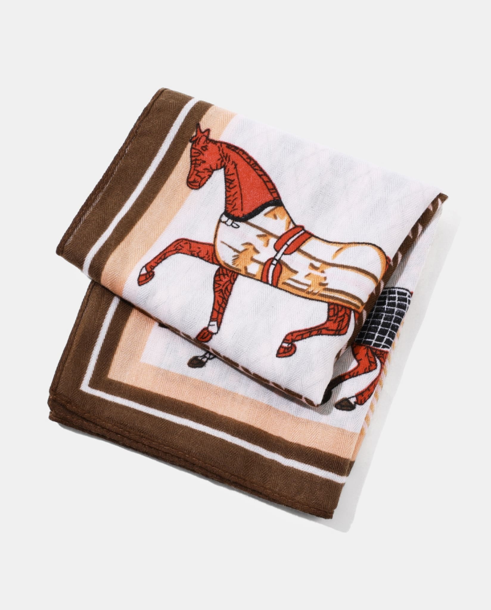 En kvadratisk scarf med ett hästinspirerat patchwork-mönster i varma, neutrala toner. En lätt och dekorativ accessoar som ger liv åt både vardagslooks och mer uppklädda outfits.