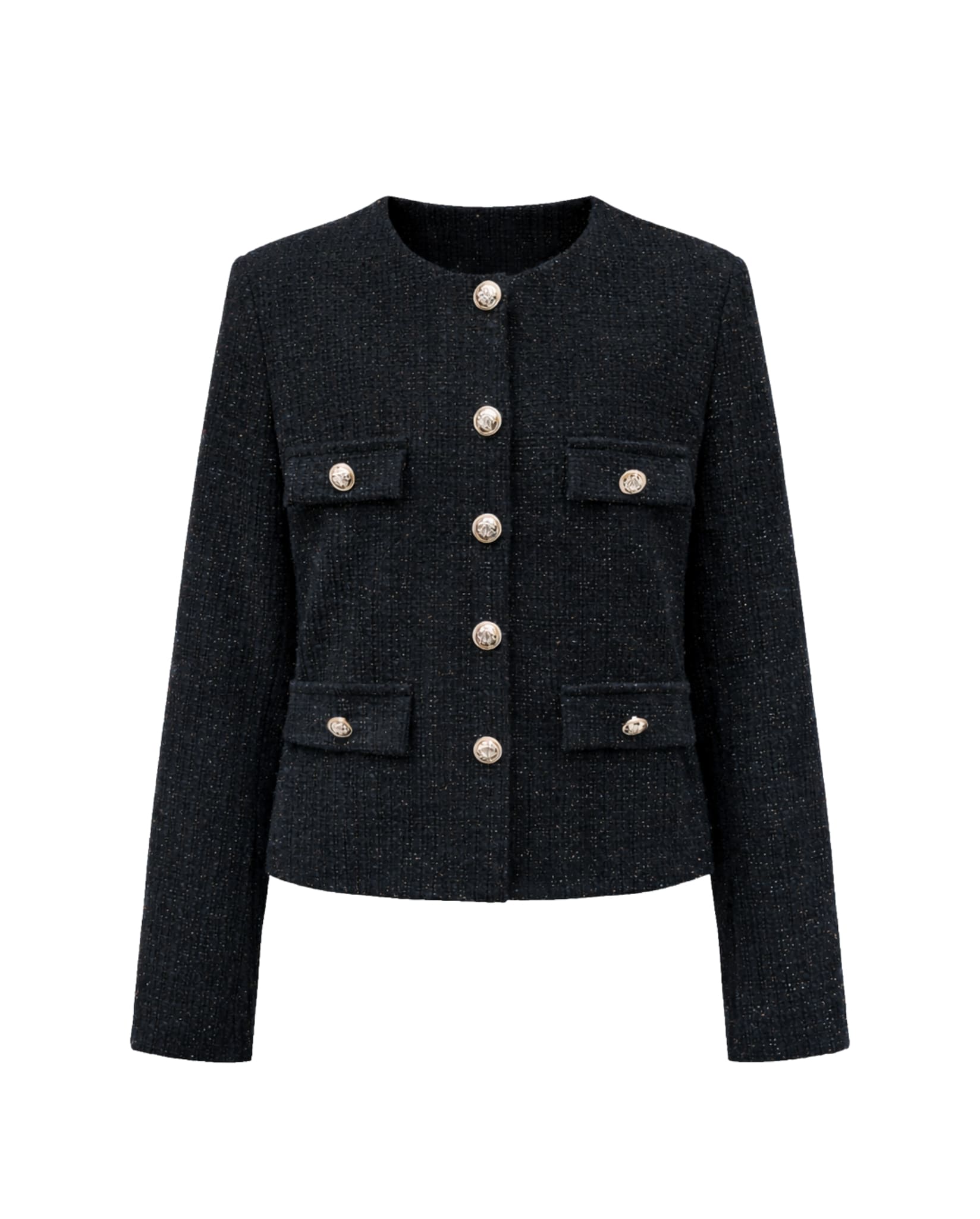 Få en tidlös och elegant stil med vår "Classic Buttoned Tweed Jacket" i svart. Tillverkad i ett lätt tweedtyg med ett diskret, glittrande skimmer har denna kavaj en rund halsringning, guldfärgade knappar och dekorativa fickor som ger en klassisk och sofistikerad stil. Satinfodret gör kavajen bekväm att bära hela dagen. En perfekt kavaj till både vardags och festligare tillfällen.