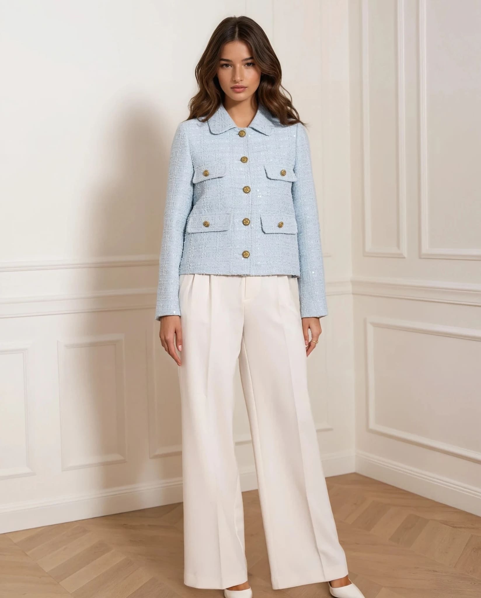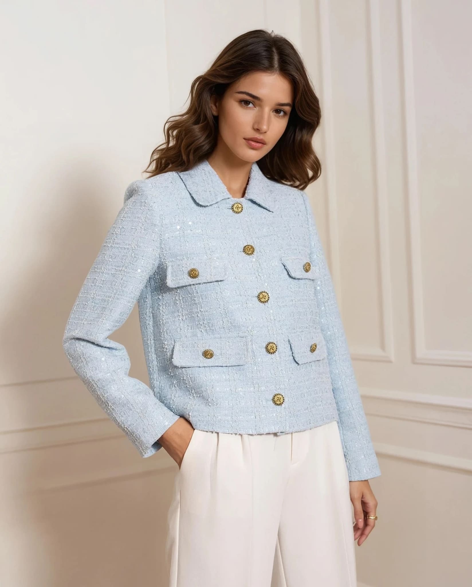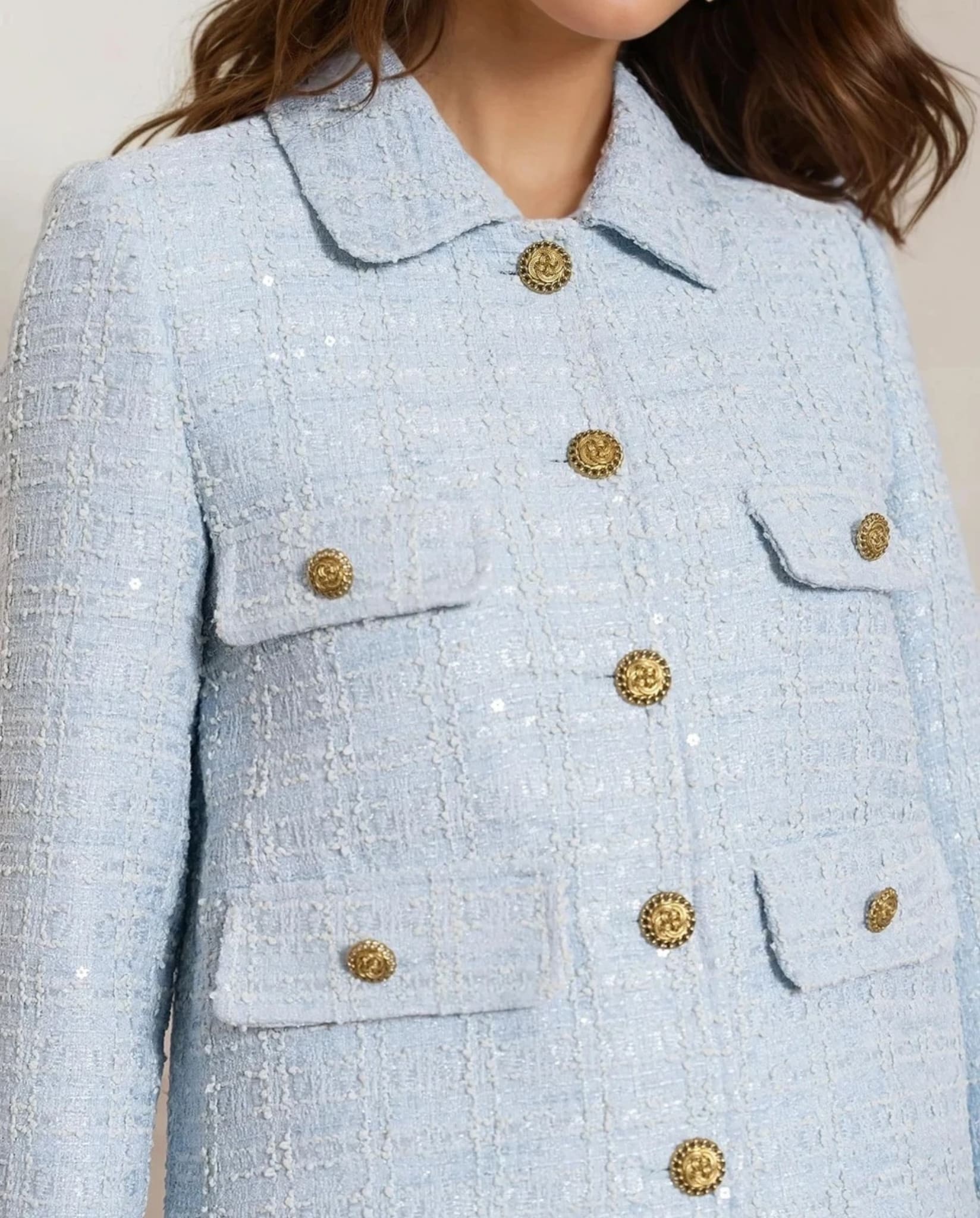 En stilren tweedjacka i en vackert pastellblå nyans med diskreta paljettdetaljer invävda i tyget. Designad med en skräddad silhuett, klassisk krage och guldtonade knappar för en elegant touch. De dekorativa fickorna förstärker den tidlösa känslan, vilket gör den till ett mångsidigt val för en välklädd look.